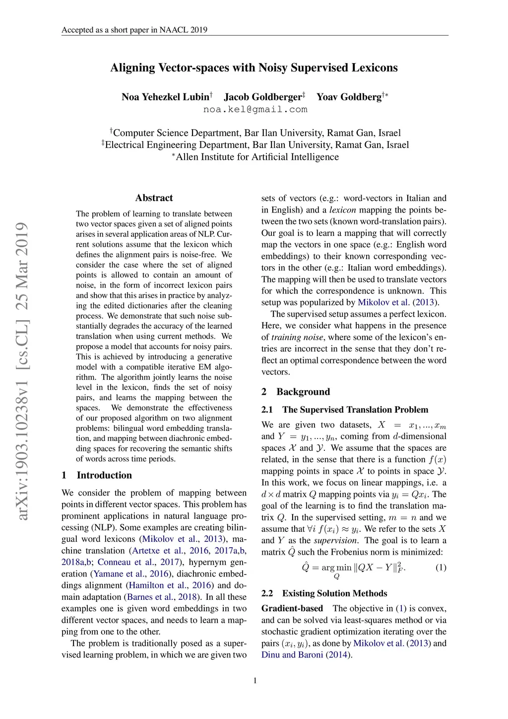 The problem of learning to translate between two vector spaces given a set of aligned points arises in several application areas of NLP. Current solutions assume that the lexicon which defines the alignment pairs is noise-free. We consider the case where the set of aligned points is allowed to contain an amount of noise, in the form of incorrect lexicon pairs and show that this arises in practice by analyzing the edited dictionaries after the cleaning process. We demonstrate that such noise substantially degrades the accuracy of the learned translation when using current methods. We propose a model that accounts for noisy pairs. This is achieved by introducing a generative model with a compatible iterative EM algorithm. The algorithm jointly learns the noise level in the lexicon, finds the set of noisy pairs, and learns the mapping between the spaces. We demonstrate the effectiveness of our proposed algorithm on two alignment problems: bilingual word embedding translation, and mapping between diachronic embedding spaces for recovering the semantic shifts of words across time periods.
