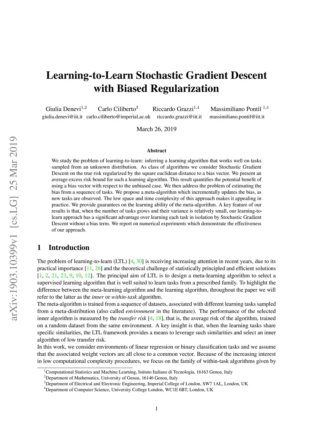 We study the problem of learning-to-learn: inferring a learning algorithm that works well on tasks sampled from an unknown distribution. As class of algorithms we consider Stochastic Gradient Descent on the true risk regularized by the square euclidean distance to a bias vector. We present an average excess risk bound for such a learning algorithm. This result quantifies the potential benefit of using a bias vector with respect to the unbiased case. We then address the problem of estimating the bias from a sequence of tasks. We propose a meta-algorithm which incrementally updates the bias, as new tasks are observed. The low space and time complexity of this approach makes it appealing in practice. We provide guarantees on the learning ability of the meta-algorithm. A key feature of our results is that, when the number of tasks grows and their variance is relatively small, our learning-to-learn approach has a significant advantage over learning each task in isolation by Stochastic Gradient Descent without a bias term. We report on numerical experiments which demonstrate the effectiveness of our approach.
