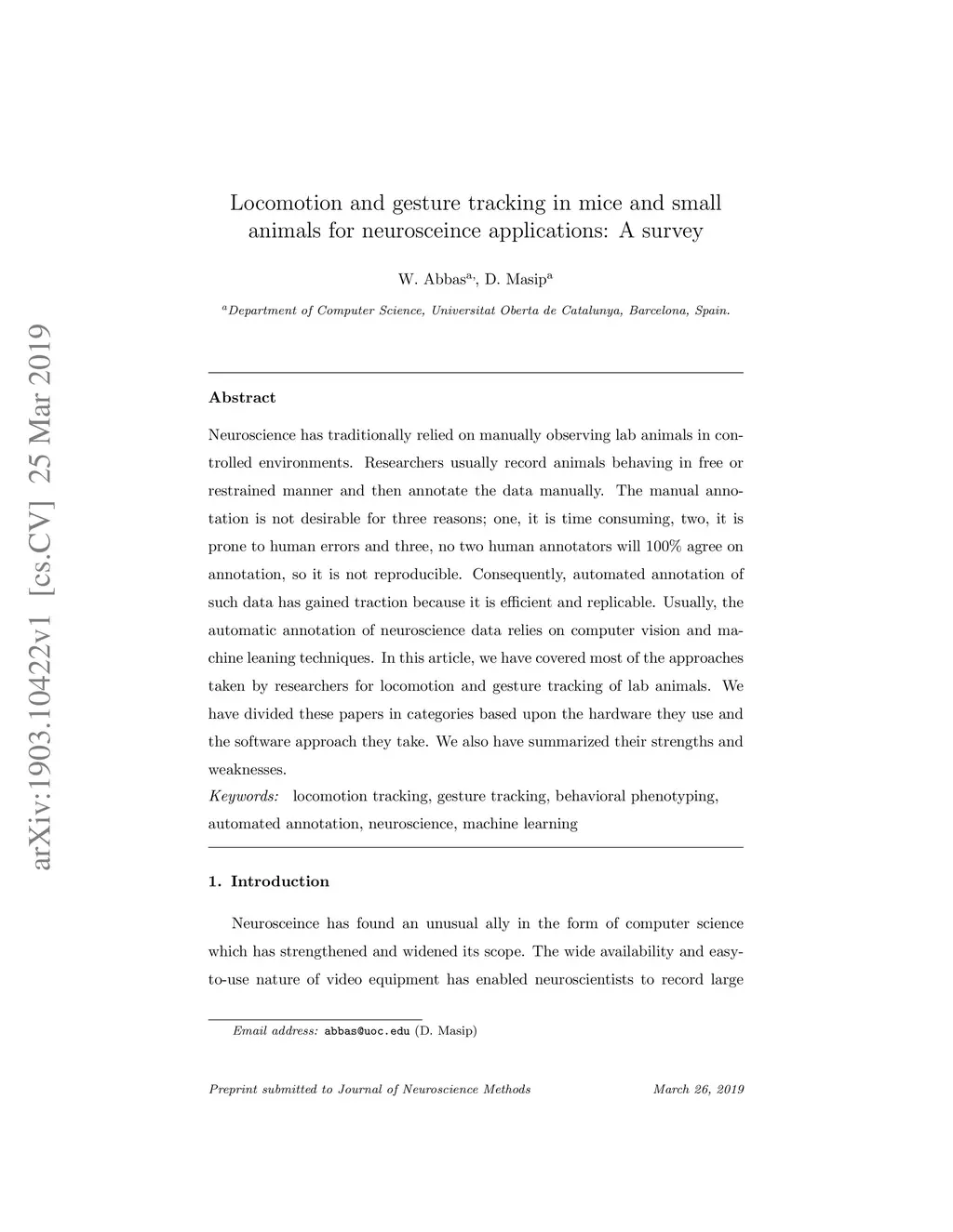 Neuroscience has traditionally relied on manually observing lab animals in controlled environments. Researchers usually record animals behaving in free or restrained manner and then annotate the data manually. The manual annotation is not desirable for three reasons; one, it is time consuming, two, it is prone to human errors and three, no two human annotators will 100\% agree on annotation, so it is not reproducible. Consequently, automated annotation of such data has gained traction because it is efficient and replicable. Usually, the automatic annotation of neuroscience data relies on computer vision and machine leaning techniques. In this article, we have covered most of the approaches taken by researchers for locomotion and gesture tracking of lab animals. We have divided these papers in categories based upon the hardware they use and the software approach they take. We also have summarized their strengths and weaknesses.