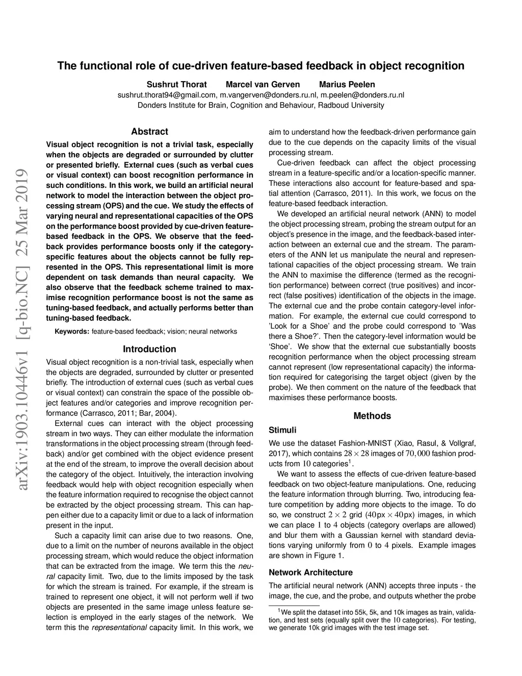 Visual object recognition is not a trivial task, especially when the objects are degraded or surrounded by clutter or presented briefly. External cues (such as verbal cues or visual context) can boost recognition performance in such conditions. In this work, we build an artificial neural network to model the interaction between the object processing stream (OPS) and the cue. We study the effects of varying neural and representational capacities of the OPS on the performance boost provided by cue-driven feature-based feedback in the OPS. We observe that the feedback provides performance boosts only if the category-specific features about the objects cannot be fully represented in the OPS. This representational limit is more dependent on task demands than neural capacity. We also observe that the feedback scheme trained to maximise recognition performance boost is not the same as tuning-based feedback, and actually performs better than tuning-based feedback.
