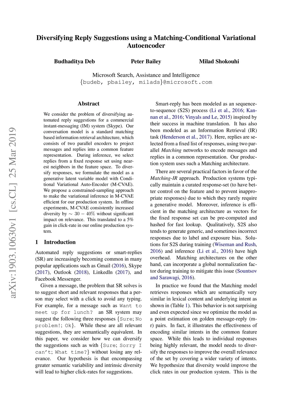 We consider the problem of diversifying automated reply suggestions for a commercial instant-messaging (IM) system (Skype). Our conversation model is a standard matching based information retrieval architecture, which consists of two parallel encoders to project messages and replies into a common feature representation. During inference, we select replies from a fixed response set using nearest neighbors in the feature space. To diversify responses, we formulate the model as a generative latent variable model with Conditional Variational Auto-Encoder (M-CVAE). We propose a constrained-sampling approach to make the variational inference in M-CVAE efficient for our production system. In offline experiments, M-CVAE consistently increased diversity by ~30-40% without significant impact on relevance. This translated to a 5% gain in click-rate in our online production system.