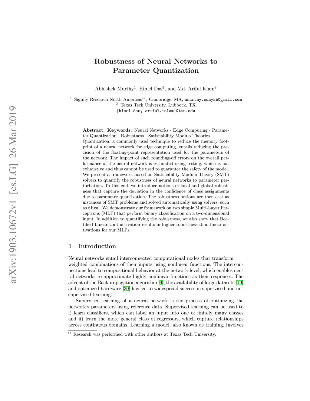 Quantization, a commonly used technique to reduce the memory footprint of a neural network for edge computing, entails reducing the precision of the floating-point representation used for the parameters of the network. The impact of such rounding-off errors on the overall performance of the neural network is estimated using testing, which is not exhaustive and thus cannot be used to guarantee the safety of the model. We present a framework based on Satisfiability Modulo Theory (SMT) solvers to quantify the robustness of neural networks to parameter perturbation. To this end, we introduce notions of local and global robustness that capture the deviation in the confidence of class assignments due to parameter quantization. The robustness notions are then cast as instances of SMT problems and solved automatically using solvers, such as dReal. We demonstrate our framework on two simple Multi-Layer Perceptrons (MLP) that perform binary classification on a two-dimensional input. In addition to quantifying the robustness, we also show that Rectified Linear Unit activation results in higher robustness than linear activations for our MLPs.