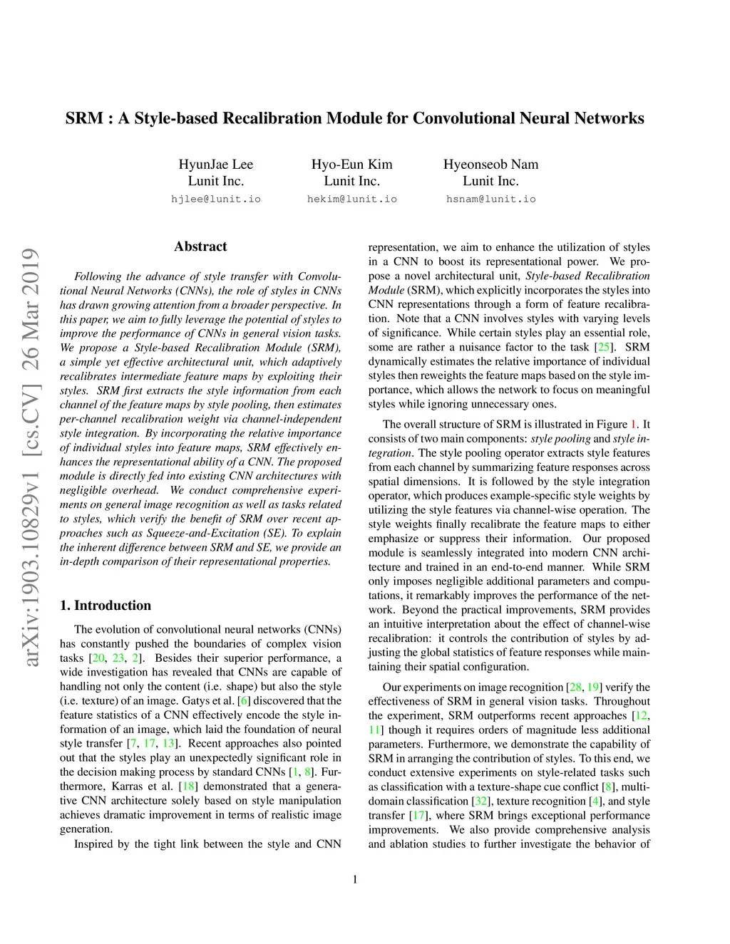 SRM : A Style-based Recalibration Module for Convolutional Neural