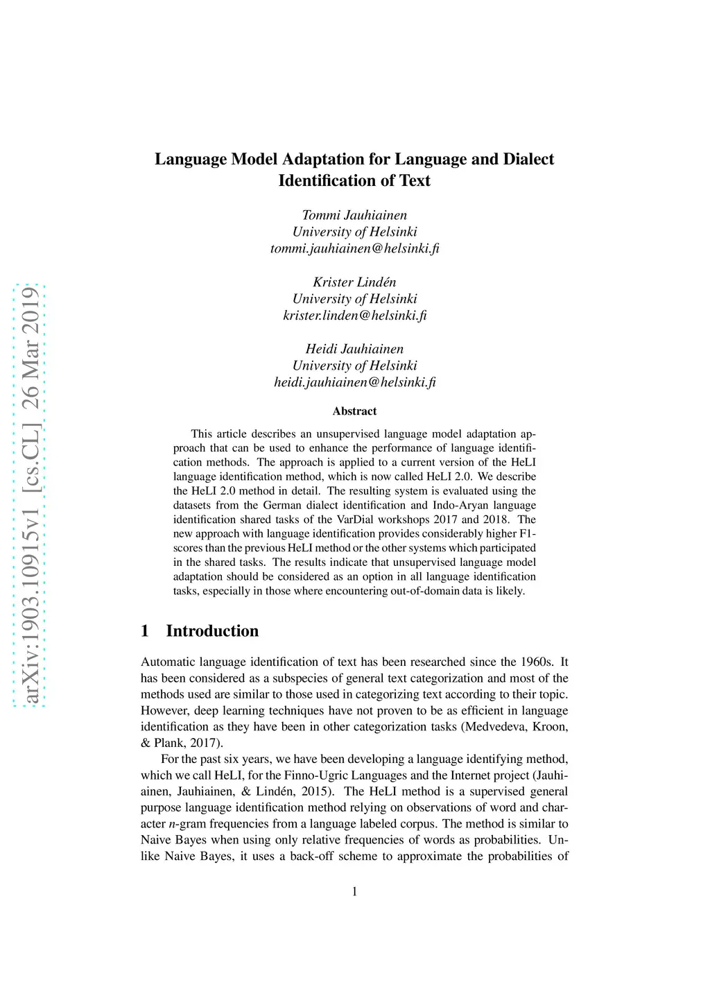 This article describes an unsupervised language model adaptation approach that can be used to enhance the performance of language identification methods. The approach is applied to a current version of the HeLI language identification method, which is now called HeLI 2.0. We describe the HeLI 2.0 method in detail. The resulting system is evaluated using the datasets from the German dialect identification and Indo-Aryan language identification shared tasks of the VarDial workshops 2017 and 2018. The new approach with language identification provides considerably higher F1-scores than the previous HeLI method or the other systems which participated in the shared tasks. The results indicate that unsupervised language model adaptation should be considered as an option in all language identification tasks, especially in those where encountering out-of-domain data is likely.