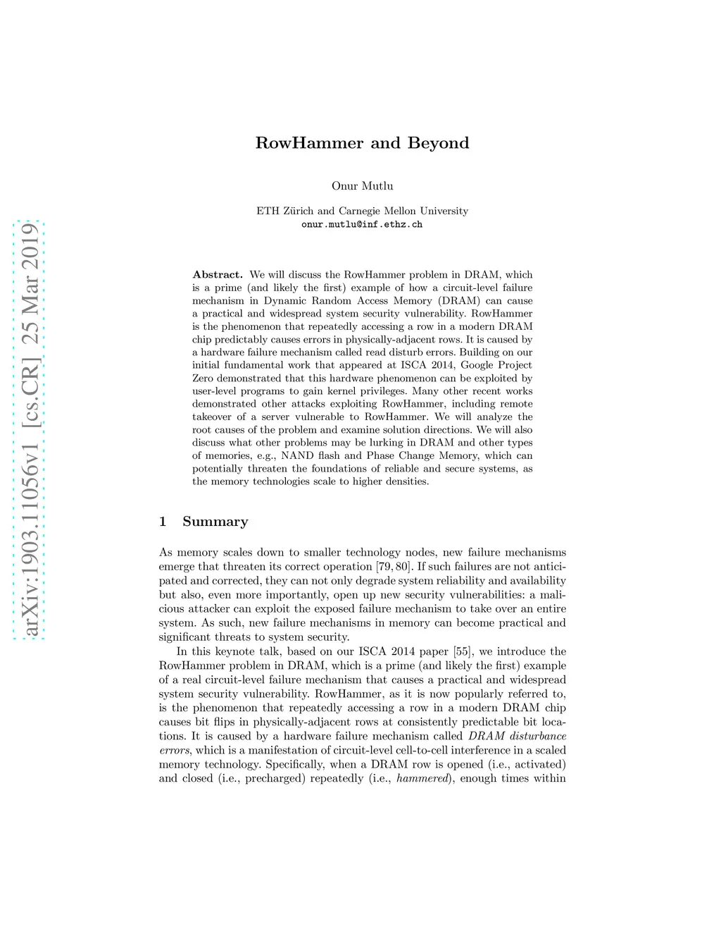 We will discuss the RowHammer problem in DRAM, which is a prime (and likely the first) example of how a circuit-level failure mechanism in Dynamic Random Access Memory (DRAM) can cause a practical and widespread system security vulnerability. RowHammer is the phenomenon that repeatedly accessing a row in a modern DRAM chip predictably causes errors in physically-adjacent rows. It is caused by a hardware failure mechanism called read disturb errors. Building on our initial fundamental work that appeared at ISCA 2014, Google Project Zero demonstrated that this hardware phenomenon can be exploited by user-level programs to gain kernel privileges. Many other recent works demonstrated other attacks exploiting RowHammer, including remote takeover of a server vulnerable to RowHammer. We will analyze the root causes of the problem and examine solution directions. We will also discuss what other problems may be lurking in DRAM and other types of memories, e.g., NAND flash and Phase Change Memory, which can potentially threaten the foundations of reliable and secure systems, as the memory technologies scale to higher densities.