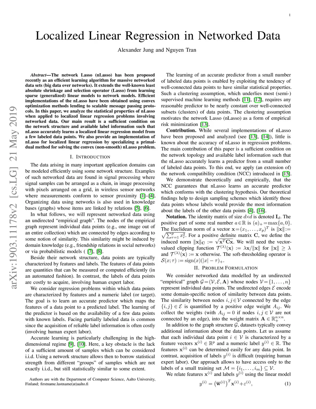 The network Lasso (nLasso) has been proposed recently as an efficient learning algorithm for massive networked data sets (big data over networks). It extends the well-known least absolute shrinkage and selection operator (Lasso) from learning sparse (generalized) linear models to network models. Efficient implementations of the nLasso have been obtained using convex optimization methods lending to scalable message passing protocols. In this paper, we analyze the statistical properties of nLasso when applied to localized linear regression problems involving networked data. Our main result is a sufficient condition on the network structure and available label information such that nLasso accurately learns a localized linear regression model from a few labeled data points. We also provide an implementation of nLasso for localized linear regression by specializing a primaldual method for solving the convex (non-smooth) nLasso problem.