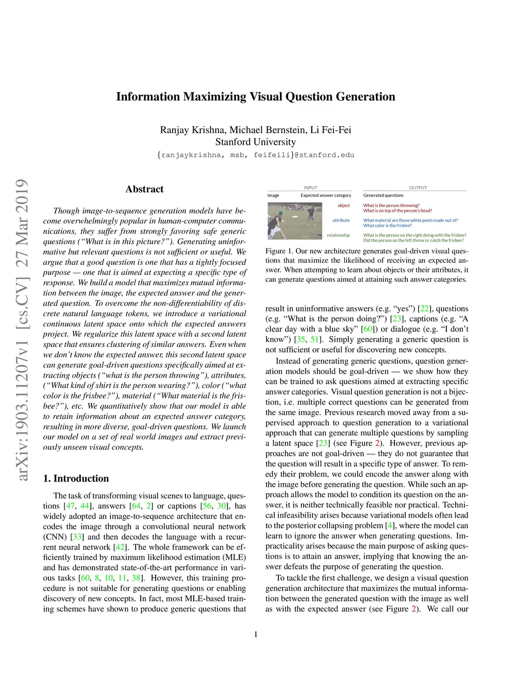 Though image-to-sequence generation models have become overwhelmingly popular in human-computer communications, they suffer from strongly favoring safe generic questions ("What is in this picture?"). Generating uninformative but relevant questions is not sufficient or useful. We argue that a good question is one that has a tightly focused purpose --- one that is aimed at expecting a specific type of response. We build a model that maximizes mutual information between the image, the expected answer and the generated question. To overcome the non-differentiability of discrete natural language tokens, we introduce a variational continuous latent space onto which the expected answers project. We regularize this latent space with a second latent space that ensures clustering of similar answers. Even when we don't know the expected answer, this second latent space can generate goal-driven questions specifically aimed at extracting objects ("what is the person throwing"), attributes, ("What kind of shirt is the person wearing?"), color ("what color is the frisbee?"), material ("What material is the frisbee?"), etc. We quantitatively show that our model is able to retain information about an expected answer category, resulting in more diverse, goal-driven questions. We launch our model on a set of real world images and extract previously unseen visual concepts.