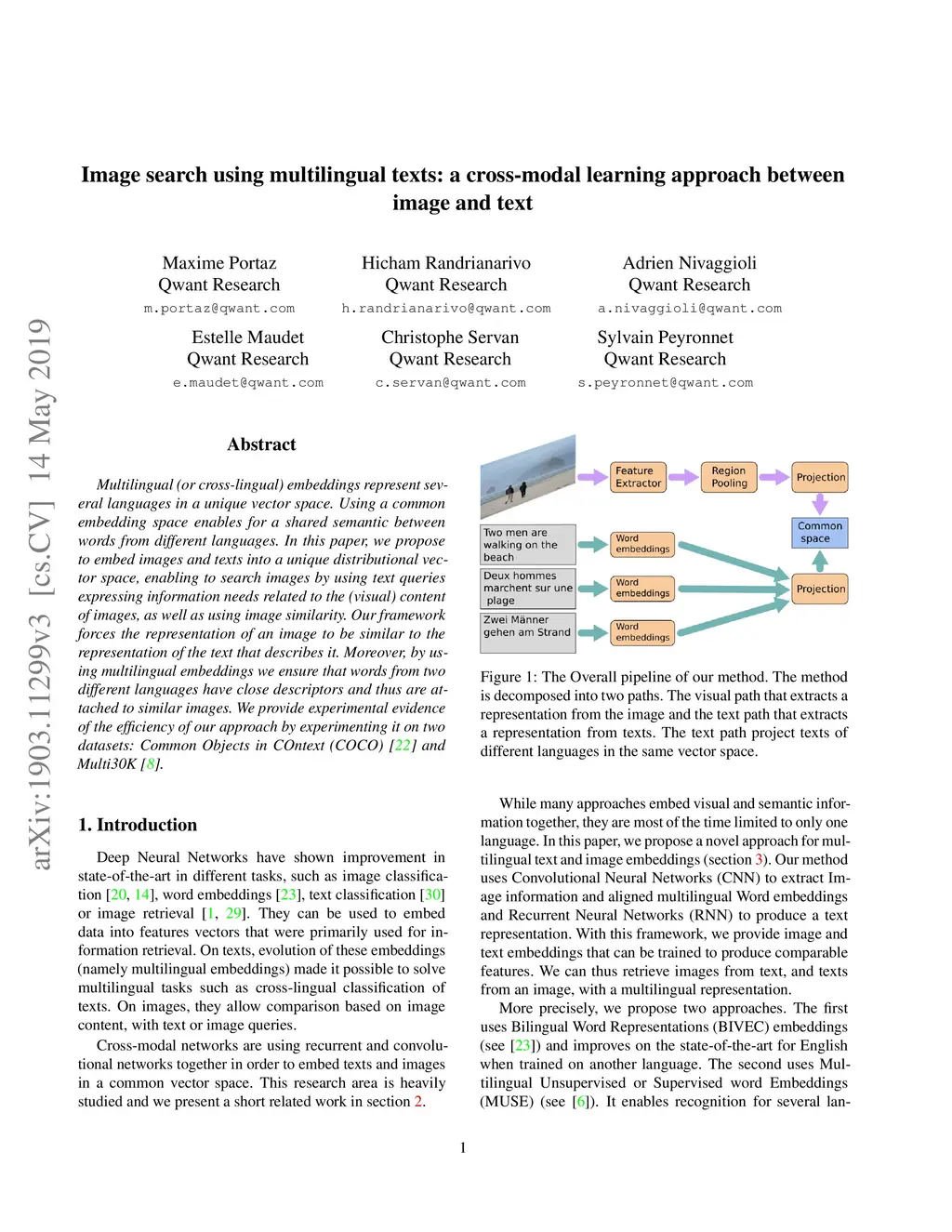 Multilingual (or cross-lingual) embeddings represent several languages in a unique vector space. Using a common embedding space enables for a shared semantic between words from different languages. In this paper, we propose to embed images and texts into a unique distributional vector space, enabling to search images by using text queries expressing information needs related to the (visual) content of images, as well as using image similarity. Our framework forces the representation of an image to be similar to the representation of the text that describes it. Moreover, by using multilingual embeddings we ensure that words from two different languages have close descriptors and thus are attached to similar images. We provide experimental evidence of the efficiency of our approach by experimenting it on two datasets: Common Objects in COntext (COCO) [19] and Multi30K [7].
