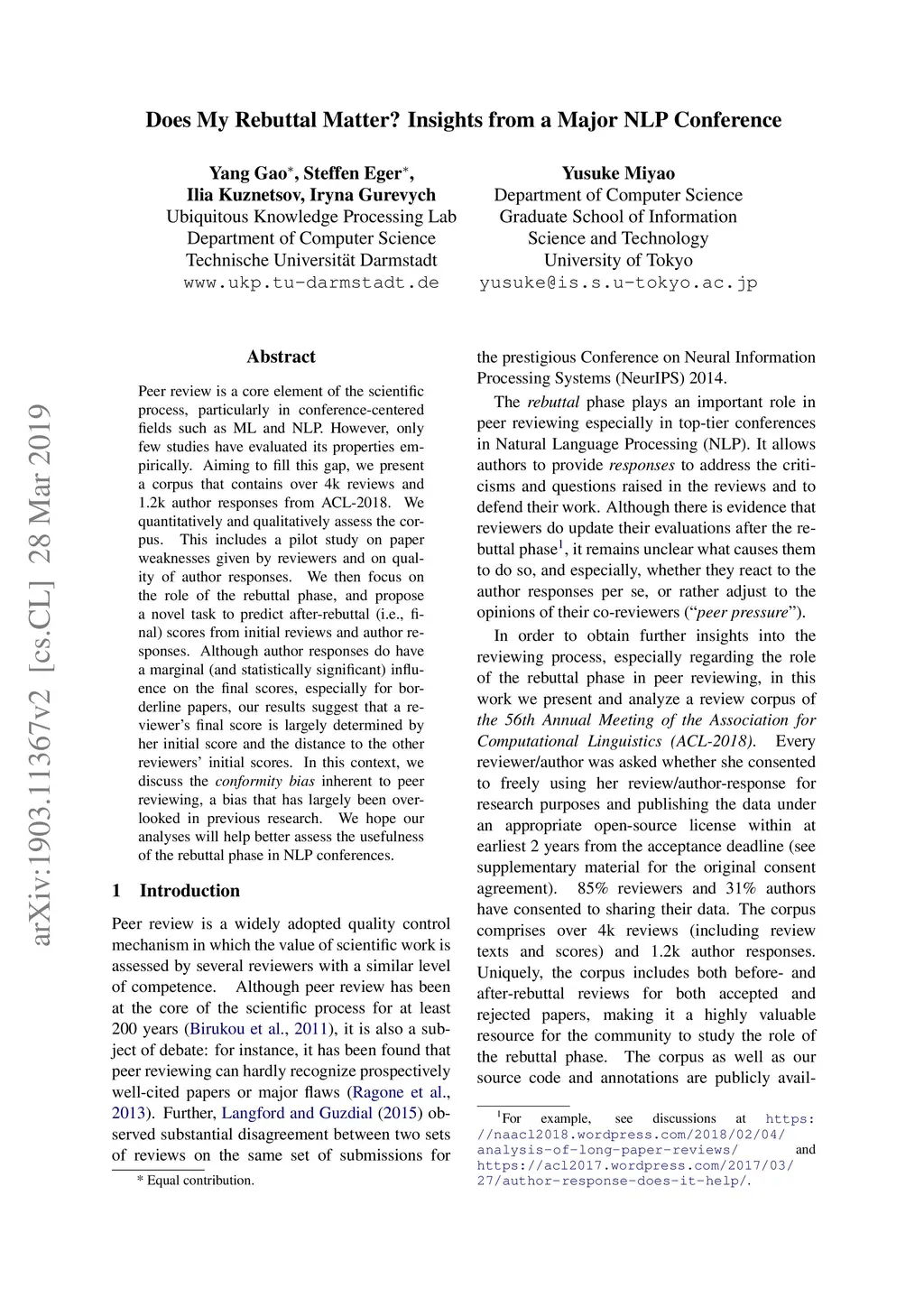 Peer review is a core element of the scientific process, particularly in conference-centered fields such as ML and NLP. However, only few studies have evaluated its properties empirically. Aiming to fill this gap, we present a corpus that contains over 4k reviews and 1.2k author responses from ACL-2018. We quantitatively and qualitatively assess the corpus. This includes a pilot study on paper weaknesses given by reviewers and on quality of author responses. We then focus on the role of the rebuttal phase, and propose a novel task to predict after-rebuttal (i.e., final) scores from initial reviews and author responses. Although author responses do have a marginal (and statistically significant) influence on the final scores, especially for borderline papers, our results suggest that a reviewer's final score is largely determined by her initial score and the distance to the other reviewers' initial scores. In this context, we discuss the conformity bias inherent to peer reviewing, a bias that has largely been overlooked in previous research. We hope our analyses will help better assess the usefulness of the rebuttal phase in NLP conferences.