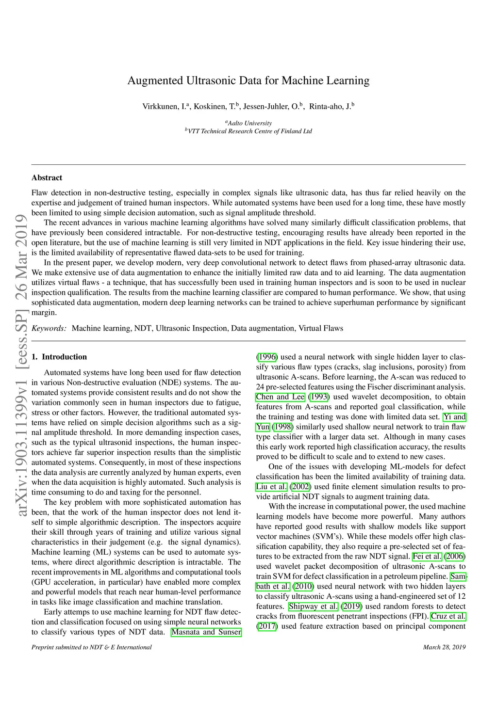Flaw detection in non-destructive testing, especially in complex signals like ultrasonic data, has thus far relied heavily on the expertise and judgement of trained human inspectors. While automated systems have been used for a long time, these have mostly been limited to using simple decision automation, such as signal amplitude threshold. The recent advances in various machine learning algorithms have solved many similarly difficult classification problems, that have previously been considered intractable. For non-destructive testing, encouraging results have already been reported in the open literature, but the use of machine learning is still very limited in NDT applications in the field. Key issue hindering their use, is the limited availability of representative flawed data-sets to be used for training. In the present paper, we develop modern, very deep convolutional network to detect flaws from phased-array ultrasonic data. We make extensive use of data augmentation to enhance the initially limited raw data and to aid learning. The data augmentation utilizes virtual flaws - a technique, that has successfully been used in training human inspectors and is soon to be used in nuclear inspection qualification. The results from the machine learning classifier are compared to human performance. We show, that using sophisticated data augmentation, modern deep learning networks can be trained to achieve superhuman performance by significant margin.