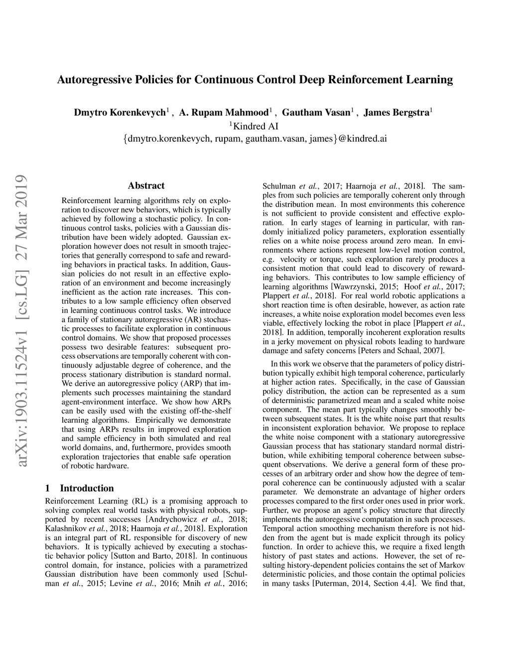 Reinforcement learning algorithms rely on exploration to discover new behaviors, which is typically achieved by following a stochastic policy. In continuous control tasks, policies with a Gaussian distribution have been widely adopted. Gaussian exploration however does not result in smooth trajectories that generally correspond to safe and rewarding behaviors in practical tasks. In addition, Gaussian policies do not result in an effective exploration of an environment and become increasingly inefficient as the action rate increases. This contributes to a low sample efficiency often observed in learning continuous control tasks. We introduce a family of stationary autoregressive (AR) stochastic processes to facilitate exploration in continuous control domains. We show that proposed processes possess two desirable features: subsequent process observations are temporally coherent with continuously adjustable degree of coherence, and the process stationary distribution is standard normal. We derive an autoregressive policy (ARP) that implements such processes maintaining the standard agent-environment interface. We show how ARPs can be easily used with the existing off-the-shelf learning algorithms. Empirically we demonstrate that using ARPs results in improved exploration and sample efficiency in both simulated and real world domains, and, furthermore, provides smooth exploration trajectories that enable safe operation of robotic hardware.