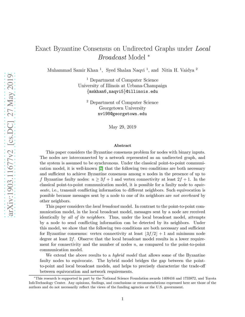 This paper considers the Byzantine consensus problem for nodes with binary inputs. The nodes are interconnected by a network represented as an undirected graph, and the system is assumed to be synchronous. Under the classical point-to-point communication model, it is well-known [7] that the following two conditions are both necessary and sufficient to achieve Byzantine consensus among nodes in the presence of up to Byzantine faulty nodes: and vertex connectivity at least . In the classical point-to-point communication model, it is possible for a faulty node to equivocate, i.e., transmit conflicting information to different neighbors. Such equivocation is possible because messages sent by a node to one of its neighbors are not overheard by other neighbors. This paper considers the local broadcast model. In contrast to the point-to-point communication model, in the local broadcast model, messages sent by a node are received identically by all of its neighbors. Thus, under the local broadcast model, attempts by a node to send conflicting information can be detected by its neighbors. Under this model, we show that the following two conditions are both necessary and sufficient for Byzantine consensus: vertex connectivity at least and minimum node degree at least . Observe that the local broadcast model results in a lower requirement for connectivity and the number of nodes , as compared to the point-to-point communication model. We extend the above results to a hybrid model that allows some of the Byzantine faulty nodes to equivocate. The hybrid model bridges the gap between the point-to-point and local broadcast models, and helps to precisely characterize the trade-off between equivocation and network requirements.