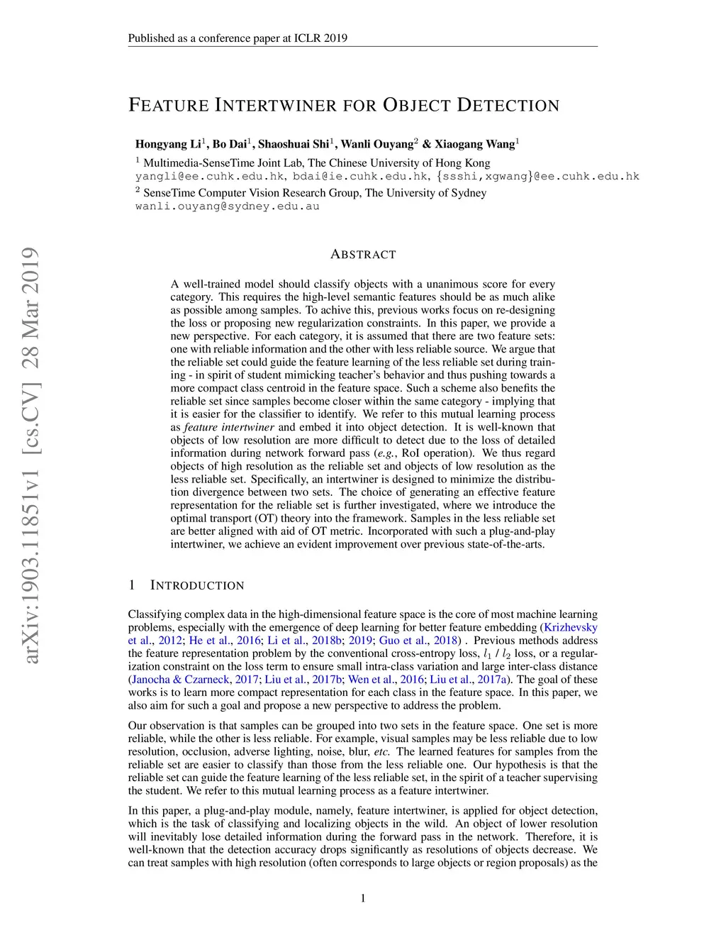 A well-trained model should classify objects with a unanimous score for every category. This requires the high-level semantic features should be as much alike as possible among samples. To achive this, previous works focus on re-designing the loss or proposing new regularization constraints. In this paper, we provide a new perspective. For each category, it is assumed that there are two feature sets: one with reliable information and the other with less reliable source. We argue that the reliable set could guide the feature learning of the less reliable set during training - in spirit of student mimicking teacher behavior and thus pushing towards a more compact class centroid in the feature space. Such a scheme also benefits the reliable set since samples become closer within the same category - implying that it is easier for the classifier to identify. We refer to this mutual learning process as feature intertwiner and embed it into object detection. It is well-known that objects of low resolution are more difficult to detect due to the loss of detailed information during network forward pass (e.g., RoI operation). We thus regard objects of high resolution as the reliable set and objects of low resolution as the less reliable set. Specifically, an intertwiner is designed to minimize the distribution divergence between two sets. The choice of generating an effective feature representation for the reliable set is further investigated, where we introduce the optimal transport (OT) theory into the framework. Samples in the less reliable set are better aligned with aid of OT metric. Incorporated with such a plug-and-play intertwiner, we achieve an evident improvement over previous state-of-the-arts.