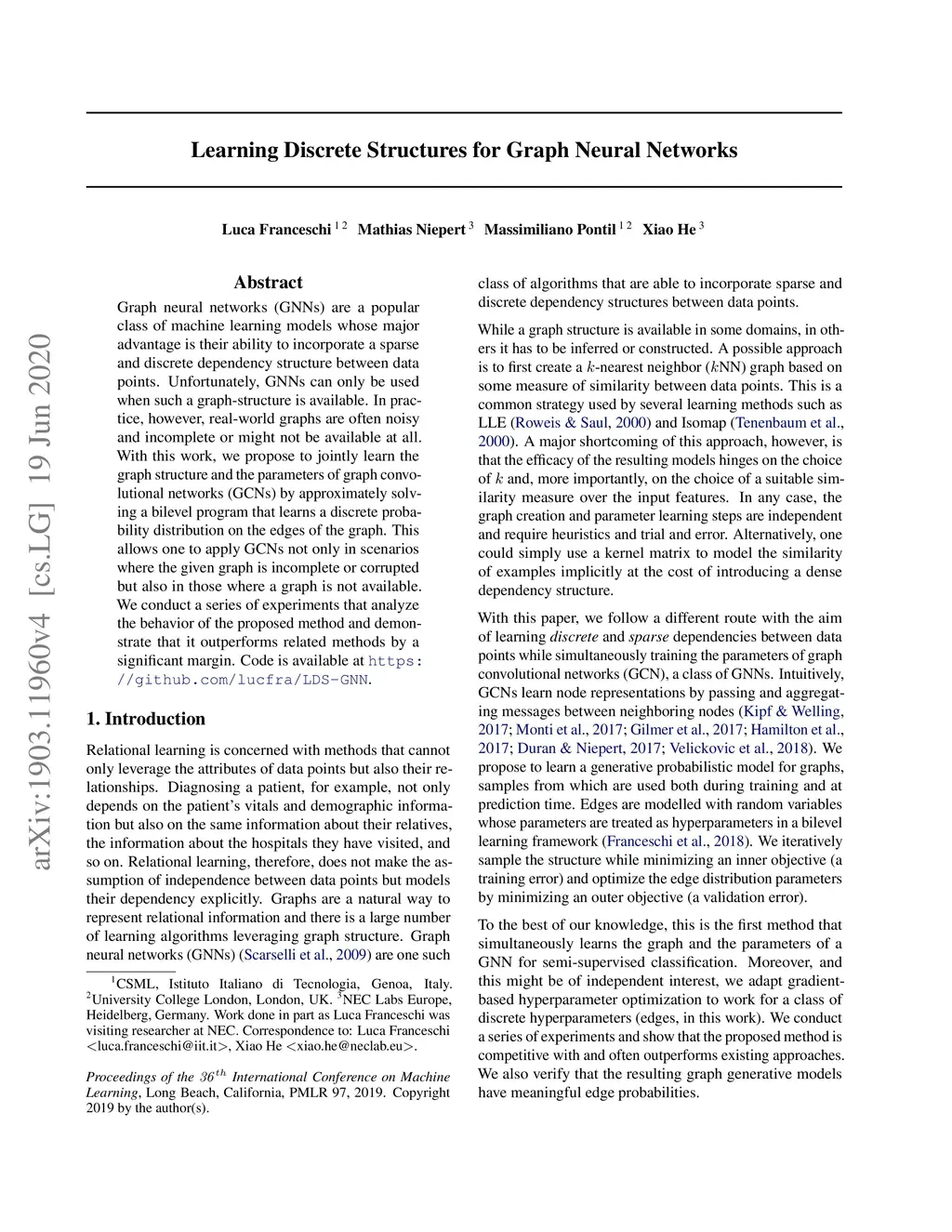 Graph neural networks (GNNs) are a popular class of machine learning models whose major advantage is their ability to incorporate a sparse and discrete dependency structure between data points. Unfortunately, GNNs can only be used when such a graph-structure is available. In practice, however, real-world graphs are often noisy and incomplete or might not be available at all. With this work, we propose to jointly learn the graph structure and the parameters of graph convolutional networks (GCNs) by approximately solving a bilevel program that learns a discrete probability distribution on the edges of the graph. This allows one to apply GCNs not only in scenarios where the given graph is incomplete or corrupted but also in those where a graph is not available. We conduct a series of experiments that analyze the behavior of the proposed method and demonstrate that it outperforms related methods by a significant margin.