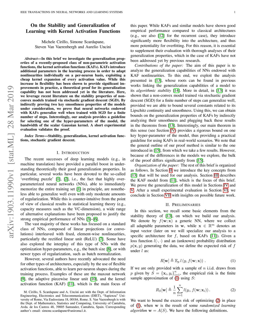 In this brief we investigate the generalization properties of a recently-proposed class of non-parametric activation functions, the kernel activation functions (KAFs). KAFs introduce additional parameters in the learning process in order to adapt nonlinearities individually on a per-neuron basis, exploiting a cheap kernel expansion of every activation value. While this increase in flexibility has been shown to provide significant improvements in practice, a theoretical proof for its generalization capability has not been addressed yet in the literature. Here, we leverage recent literature on the stability properties of non-convex models trained via stochastic gradient descent (SGD). By indirectly proving two key smoothness properties of the models under consideration, we prove that neural networks endowed with KAFs generalize well when trained with SGD for a finite number of steps. Interestingly, our analysis provides a guideline for selecting one of the hyper-parameters of the model, the bandwidth of the scalar Gaussian kernel. A short experimental evaluation validates the proof.