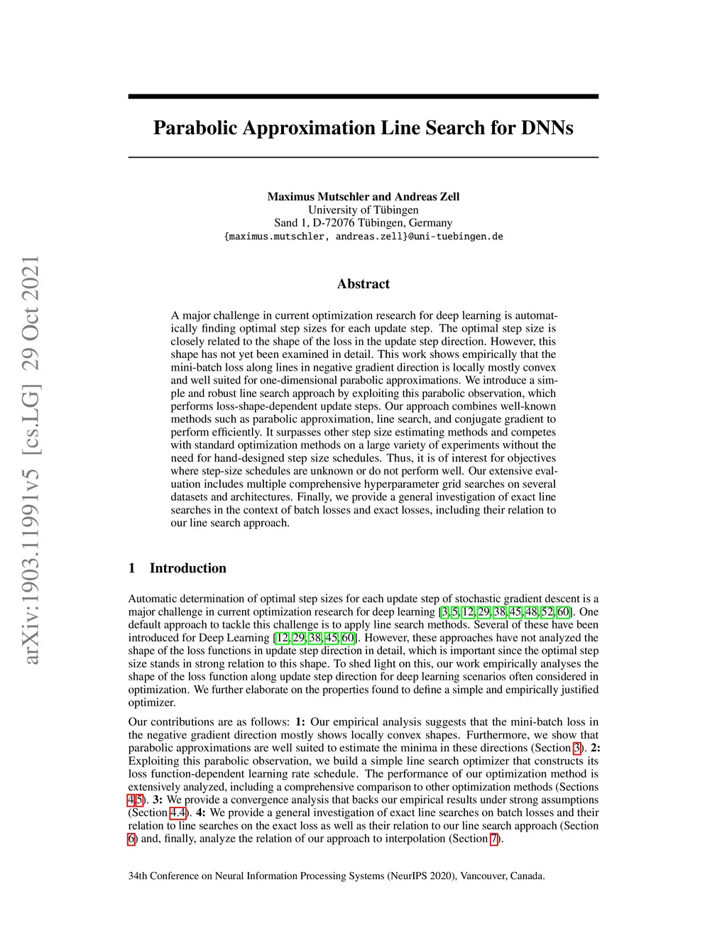 A major challenge in current optimization research for deep learning is to automatically find optimal step sizes for each update step. The optimal step size is closely related to the shape of the loss in the update step direction. However, this shape has not yet been examined in detail. This work shows empirically that the batch loss over lines in negative gradient direction is mostly convex locally and well suited for one-dimensional parabolic approximations. By exploiting this parabolic property we introduce a simple and robust line search approach, which performs loss-shape dependent update steps. Our approach combines well-known methods such as parabolic approximation, line search and conjugate gradient, to perform efficiently. It surpasses other step size estimating methods and competes with common optimization methods on a large variety of experiments without the need of hand-designed step size schedules. Thus, it is of interest for objectives where step-size schedules are unknown or do not perform well. Our extensive evaluation includes multiple comprehensive hyperparameter grid searches on several datasets and architectures. Finally, we provide a general investigation of exact line searches in the context of batch losses and exact losses, including their relation to our line search approach.