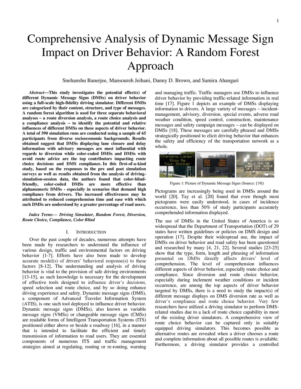 This study investigates the potential effects of different Dynamic Message Signs (DMSs) on driver behavior using a full-scale high-fidelity driving simulator. Different DMSs are categorized by their content, structure, and type of messages. A random forest algorithm is used for three separate behavioral analyses; a route diversion analysis, a route choice analysis and a compliance analysis; to identify the potential and relative influences of different DMSs on these aspects of driver behavior. A total of 390 simulation runs are conducted using a sample of 65 participants from diverse socioeconomic backgrounds. Results obtained suggest that DMSs displaying lane closure and delay information with advisory messages are most influential with regards to diversion while color-coded DMSs and DMSs with avoid route advice are the top contributors impacting route choice decisions and DMS compliance. In this first-of-a-kind study, based on the responses to the pre and post simulation surveys as well as results obtained from the analysis of driving-simulation-session data, the authors found that color-blind-friendly, color-coded DMSs are more effective than alphanumeric DMSs - especially in scenarios that demand high compliance from drivers. The increased effectiveness may be attributed to reduced comprehension time and ease with which such DMSs are understood by a greater percentage of road users.