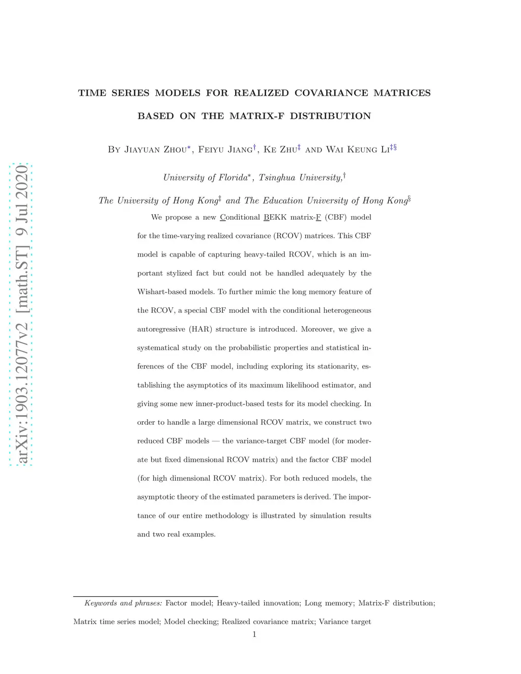 We propose a new Conditional BEKK matrix-F (CBF) model for the time-varying realized covariance (RCOV) matrices. This CBF model is capable of capturing heavy-tailed RCOV, which is an important stylized fact but could not be handled adequately by the Wishart-based models. To further mimic the long memory feature of the RCOV, a special CBF model with the conditional heterogeneous autoregressive (HAR) structure is introduced. Moreover, we give a systematical study on the probabilistic properties and statistical inferences of the CBF model, including exploring its stationarity, establishing the asymptotics of its maximum likelihood estimator, and giving some new inner-product-based tests for its model checking. In order to handle a large dimensional RCOV matrix, we construct two reduced CBF models --- the variance-target CBF model (for moderate but fixed dimensional RCOV matrix) and the factor CBF model (for high dimensional RCOV matrix). For both reduced models, the asymptotic theory of the estimated parameters is derived. The importance of our entire methodology is illustrated by simulation results and two real examples.