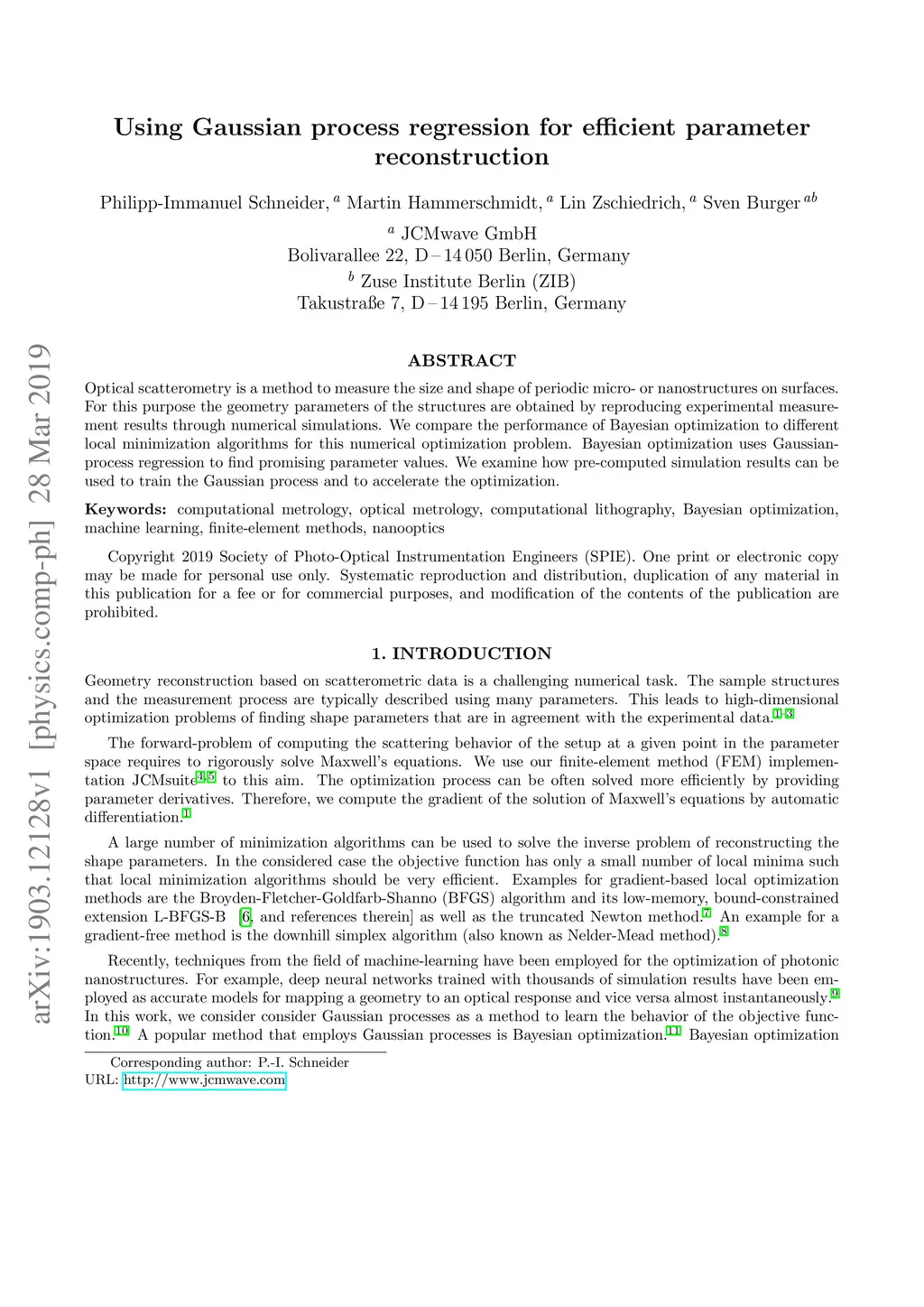 Optical scatterometry is a method to measure the size and shape of periodic micro- or nanostructures on surfaces. For this purpose the geometry parameters of the structures are obtained by reproducing experimental measurement results through numerical simulations. We compare the performance of Bayesian optimization to different local minimization algorithms for this numerical optimization problem. Bayesian optimization uses Gaussian-process regression to find promising parameter values. We examine how pre-computed simulation results can be used to train the Gaussian process and to accelerate the optimization.