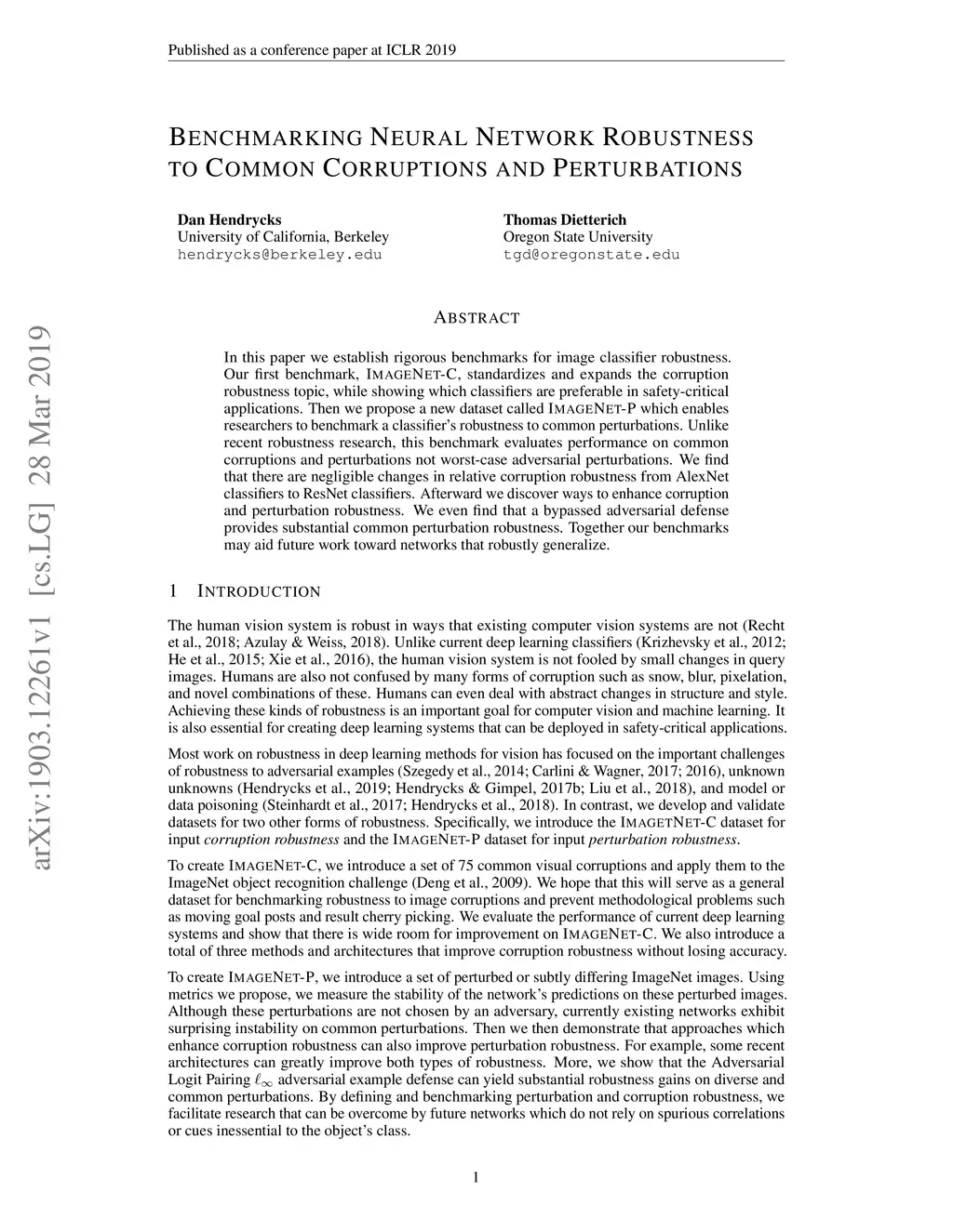 In this paper we establish rigorous benchmarks for image classifier robustness. Our first benchmark, ImageNet-C, standardizes and expands the corruption robustness topic, while showing which classifiers are preferable in safety-critical applications. Then we propose a new dataset called ImageNet-P which enables researchers to benchmark a classifier's robustness to common perturbations. Unlike recent robustness research, this benchmark evaluates performance on common corruptions and perturbations not worst-case adversarial perturbations. We find that there are negligible changes in relative corruption robustness from AlexNet classifiers to ResNet classifiers. Afterward we discover ways to enhance corruption and perturbation robustness. We even find that a bypassed adversarial defense provides substantial common perturbation robustness. Together our benchmarks may aid future work toward networks that robustly generalize.