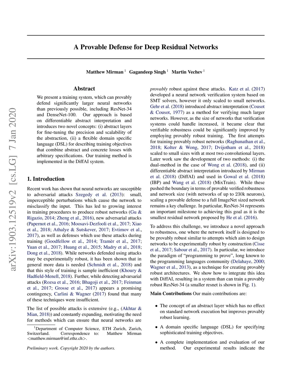 We present a training system, which can provably defend significantly larger neural networks than previously possible, including ResNet-34 and DenseNet-100. Our approach is based on differentiable abstract interpretation and introduces two novel concepts: (i) abstract layers for fine-tuning the precision and scalability of the abstraction, (ii) a flexible domain specific language (DSL) for describing training objectives that combine abstract and concrete losses with arbitrary specifications. Our training method is implemented in the DiffAI system.
