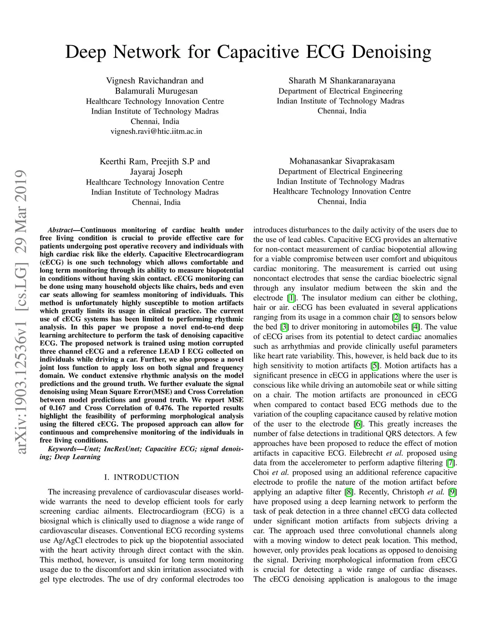 Continuous monitoring of cardiac health under free living condition is crucial to provide effective care for patients undergoing post operative recovery and individuals with high cardiac risk like the elderly. Capacitive Electrocardiogram (cECG) is one such technology which allows comfortable and long term monitoring through its ability to measure biopotential in conditions without having skin contact. cECG monitoring can be done using many household objects like chairs, beds and even car seats allowing for seamless monitoring of individuals. This method is unfortunately highly susceptible to motion artifacts which greatly limits its usage in clinical practice. The current use of cECG systems has been limited to performing rhythmic analysis. In this paper we propose a novel end-to-end deep learning architecture to perform the task of denoising capacitive ECG. The proposed network is trained using motion corrupted three channel cECG and a reference LEAD I ECG collected on individuals while driving a car. Further, we also propose a novel joint loss function to apply loss on both signal and frequency domain. We conduct extensive rhythmic analysis on the model predictions and the ground truth. We further evaluate the signal denoising using Mean Square Error(MSE) and Cross Correlation between model predictions and ground truth. We report MSE of 0.167 and Cross Correlation of 0.476. The reported results highlight the feasibility of performing morphological analysis using the filtered cECG. The proposed approach can allow for continuous and comprehensive monitoring of the individuals in free living conditions.
