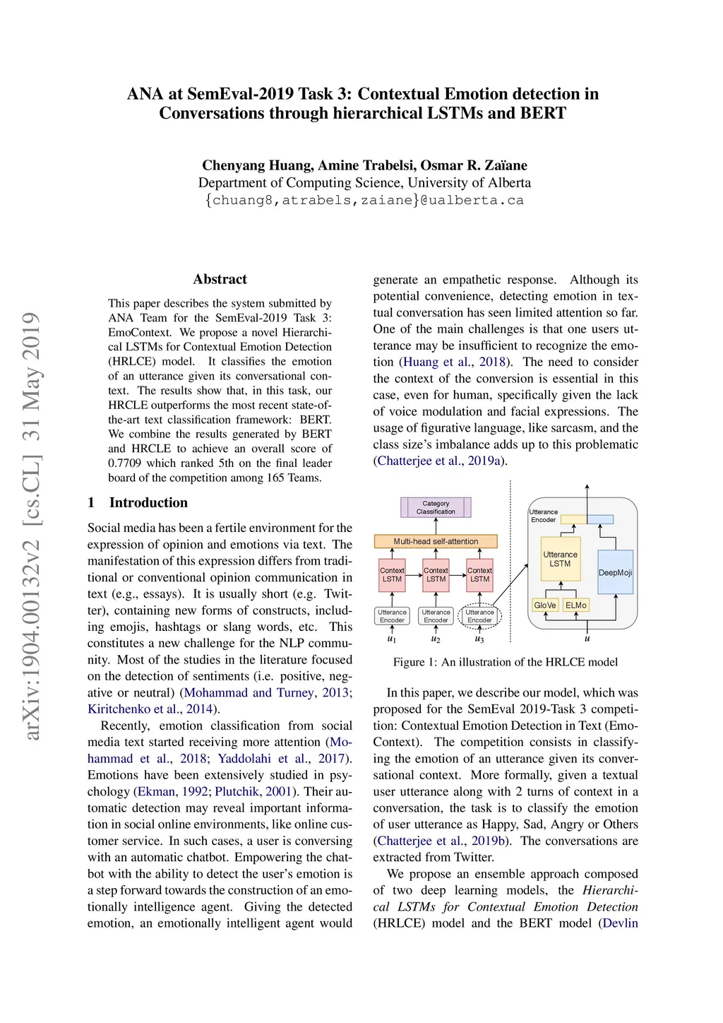 This paper describes the system submitted by ANA Team for the SemEval-2019 Task 3: EmoContext. We propose a novel Hierarchical LSTMs for Contextual Emotion Detection (HRLCE) model. It classifies the emotion of an utterance given its conversational context. The results show that, in this task, our HRCLE outperforms the most recent state-of-the-art text classification framework: BERT. We combine the results generated by BERT and HRCLE to achieve an overall score of 0.7709 which ranked 5th on the final leader board of the competition among 165 Teams.