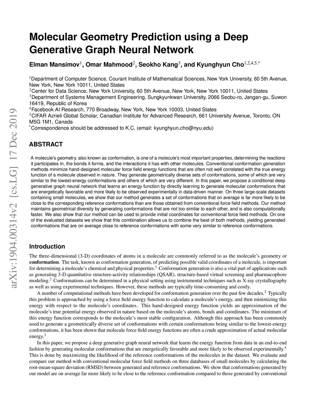 A molecule's geometry, also known as conformation, is one of a molecule's most important properties, determining the reactions it participates in, the bonds it forms, and the interactions it has with other molecules. Conventional conformation generation methods minimize hand-designed molecular force field energy functions that are often not well correlated with the true energy function of a molecule observed in nature. They generate geometrically diverse sets of conformations, some of which are very similar to the lowest-energy conformations and others of which are very different. In this paper, we propose a conditional deep generative graph neural network that learns an energy function by directly learning to generate molecular conformations that are energetically favorable and more likely to be observed experimentally in data-driven manner. On three large-scale datasets containing small molecules, we show that our method generates a set of conformations that on average is far more likely to be close to the corresponding reference conformations than are those obtained from conventional force field methods. Our method maintains geometrical diversity by generating conformations that are not too similar to each other, and is also computationally faster. We also show that our method can be used to provide initial coordinates for conventional force field methods. On one of the evaluated datasets we show that this combination allows us to combine the best of both methods, yielding generated conformations that are on average close to reference conformations with some very similar to reference conformations.