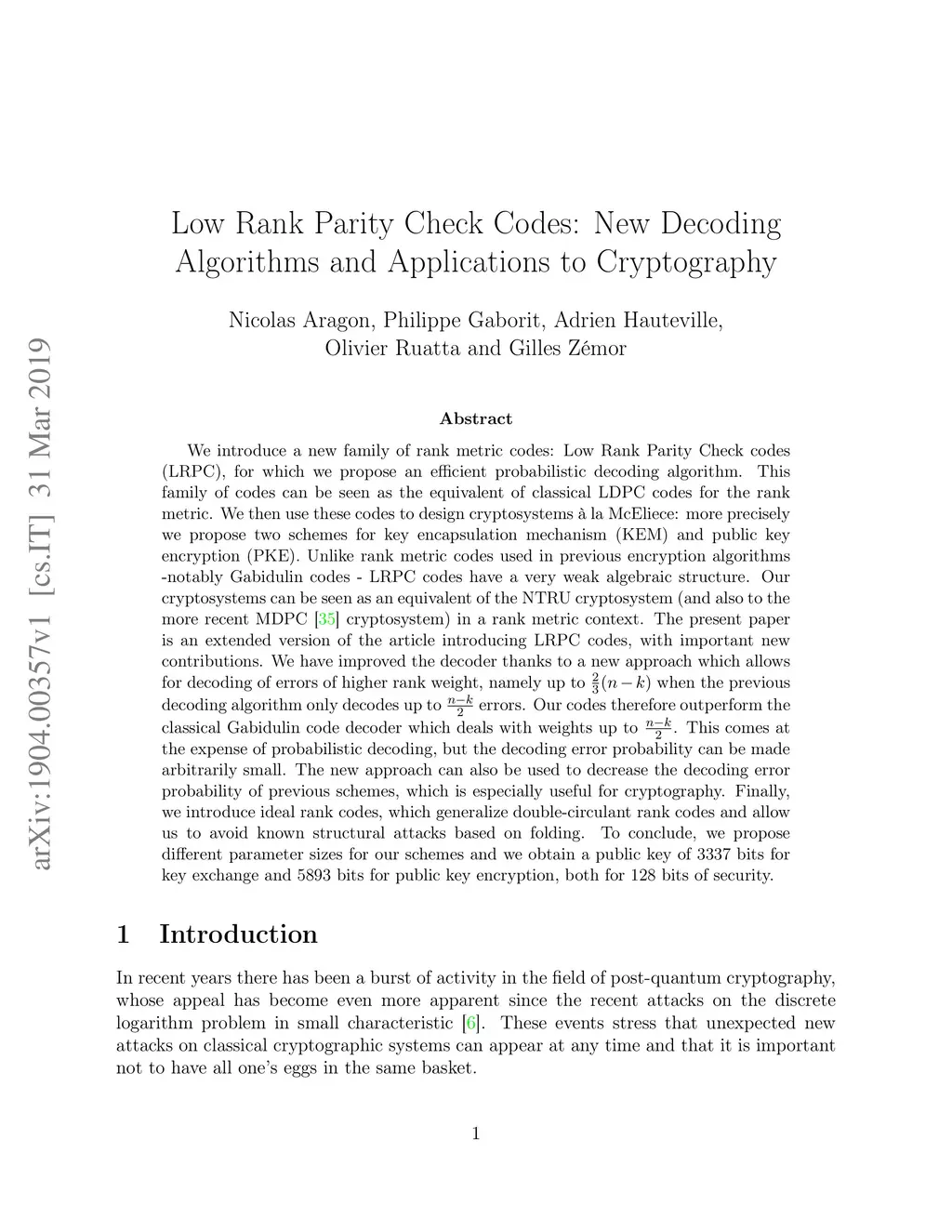 We introduce a new family of rank metric codes: Low Rank Parity Check codes (LRPC), for which we propose an efficient probabilistic decoding algorithm. This family of codes can be seen as the equivalent of classical LDPC codes for the rank metric. We then use these codes to design cryptosystems \`a la McEliece: more precisely we propose two schemes for key encapsulation mechanism (KEM) and public key encryption (PKE). Unlike rank metric codes used in previous encryption algorithms -notably Gabidulin codes - LRPC codes have a very weak algebraic structure. Our cryptosystems can be seen as an equivalent of the NTRU cryptosystem (and also to the more recent MDPC \cite{MTSB12} cryptosystem) in a rank metric context. The present paper is an extended version of the article introducing LRPC codes, with important new contributions. We have improved the decoder thanks to a new approach which allows for decoding of errors of higher rank weight, namely up to when the previous decoding algorithm only decodes up to errors. Our codes therefore outperform the classical Gabidulin code decoder which deals with weights up to . This comes at the expense of probabilistic decoding, but the decoding error probability can be made arbitrarily small. The new approach can also be used to decrease the decoding error probability of previous schemes, which is especially useful for cryptography. Finally, we introduce ideal rank codes, which generalize double-circulant rank codes and allow us to avoid known structural attacks based on folding. To conclude, we propose different parameter sizes for our schemes and we obtain a public key of 3337 bits for key exchange and 5893 bits for public key encryption, both for 128 bits of security.