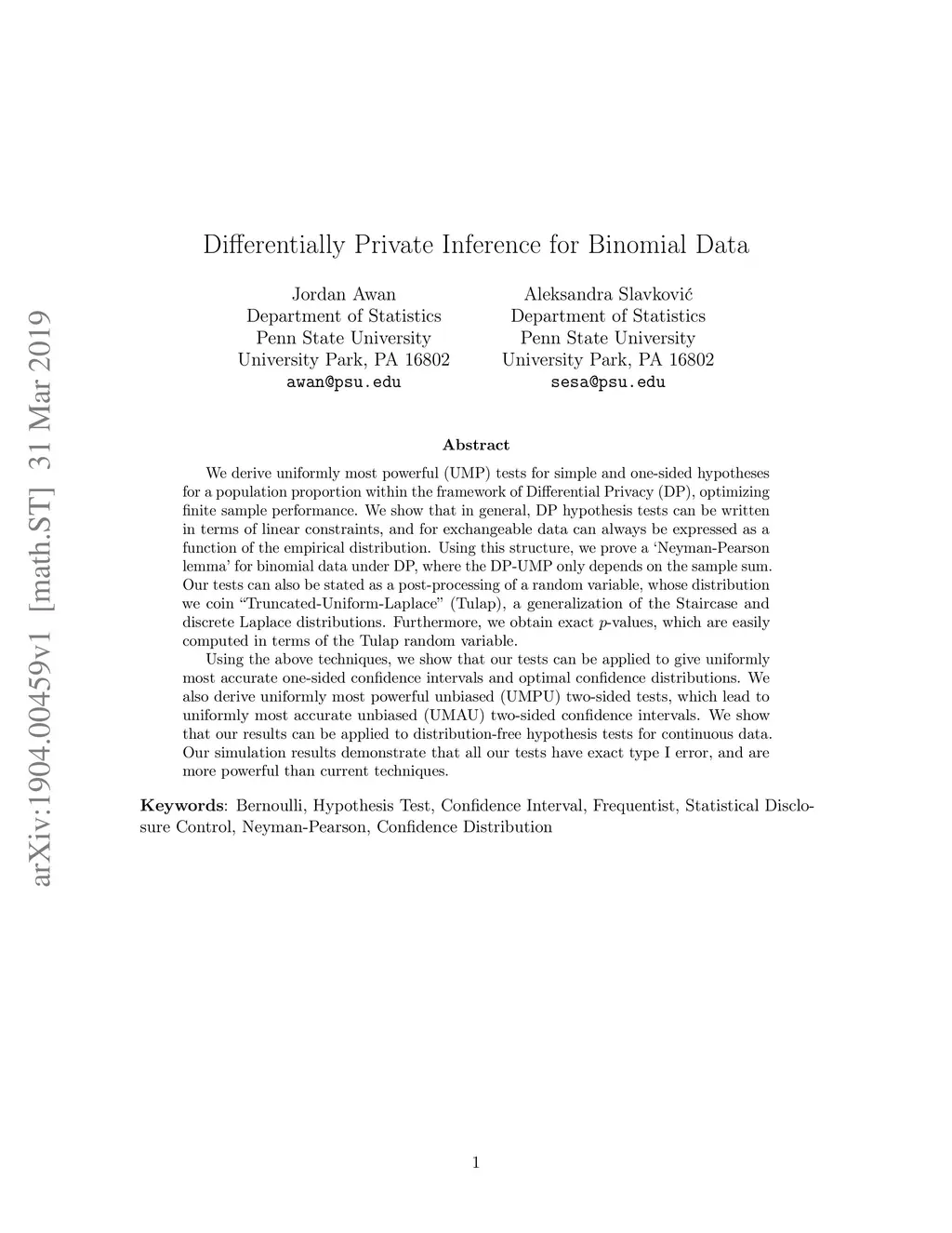We derive uniformly most powerful (UMP) tests for simple and one-sided hypotheses for a population proportion within the framework of Differential Privacy (DP), optimizing finite sample performance. We show that in general, DP hypothesis tests can be written in terms of linear constraints, and for exchangeable data can always be expressed as a function of the empirical distribution. Using this structure, we prove a Ñeyman-Pearson lemma' for binomial data under DP, where the DP-UMP only depends on the sample sum. Our tests can also be stated as a post-processing of a random variable, whose distribution we coin ''Truncated-Uniform-Laplace'' (Tulap), a generalization of the Staircase and discrete Laplace distributions. Furthermore, we obtain exact -values, which are easily computed in terms of the Tulap random variable. Using the above techniques, we show that our tests can be applied to give uniformly most accurate one-sided confidence intervals and optimal confidence distributions. We also derive uniformly most powerful unbiased (UMPU) two-sided tests, which lead to uniformly most accurate unbiased (UMAU) two-sided confidence intervals. We show that our results can be applied to distribution-free hypothesis tests for continuous data. Our simulation results demonstrate that all our tests have exact type I error, and are more powerful than current techniques.
