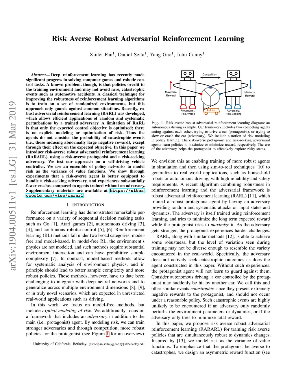 Deep reinforcement learning has recently made significant progress in solving computer games and robotic control tasks. A known problem, though, is that policies overfit to the training environment and may not avoid rare, catastrophic events such as automotive accidents. A classical technique for improving the robustness of reinforcement learning algorithms is to train on a set of randomized environments, but this approach only guards against common situations. Recently, robust adversarial reinforcement learning (RARL) was developed, which allows efficient applications of random and systematic perturbations by a trained adversary. A limitation of RARL is that only the expected control objective is optimized; there is no explicit modeling or optimization of risk. Thus the agents do not consider the probability of catastrophic events (i.e., those inducing abnormally large negative reward), except through their effect on the expected objective. In this paper we introduce risk-averse robust adversarial reinforcement learning (RARARL), using a risk-averse protagonist and a risk-seeking adversary. We test our approach on a self-driving vehicle controller. We use an ensemble of policy networks to model risk as the variance of value functions. We show through experiments that a risk-averse agent is better equipped to handle a risk-seeking adversary, and experiences substantially fewer crashes compared to agents trained without an adversary.