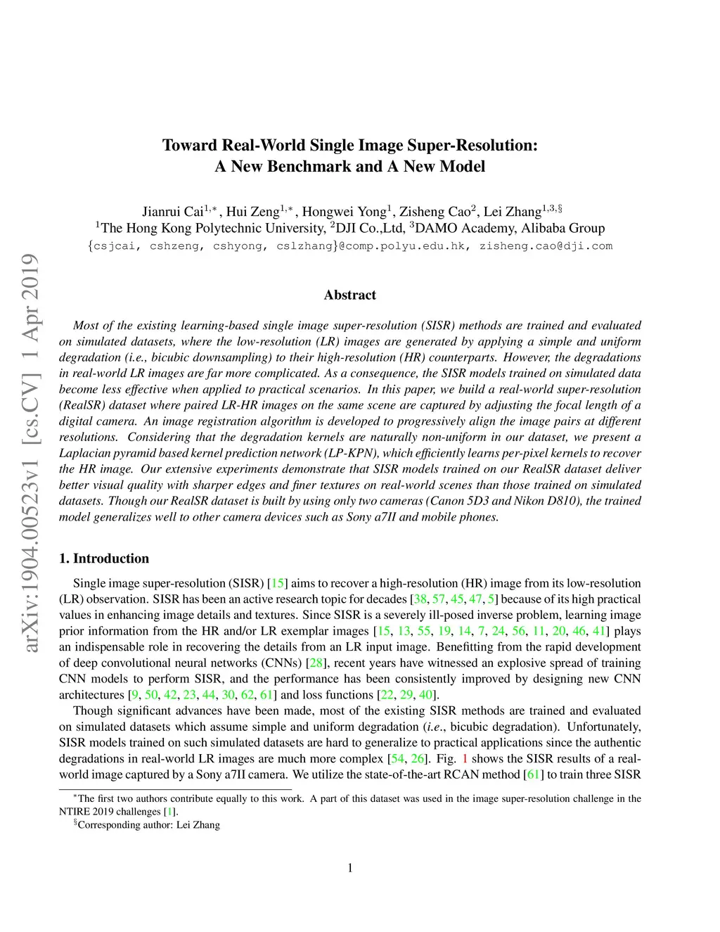 Most of the existing learning-based single image superresolution (SISR) methods are trained and evaluated on simulated datasets, where the low-resolution (LR) images are generated by applying a simple and uniform degradation (i.e., bicubic downsampling) to their high-resolution (HR) counterparts. However, the degradations in real-world LR images are far more complicated. As a consequence, the SISR models trained on simulated data become less effective when applied to practical scenarios. In this paper, we build a real-world super-resolution (RealSR) dataset where paired LR-HR images on the same scene are captured by adjusting the focal length of a digital camera. An image registration algorithm is developed to progressively align the image pairs at different resolutions. Considering that the degradation kernels are naturally non-uniform in our dataset, we present a Laplacian pyramid based kernel prediction network (LP-KPN), which efficiently learns per-pixel kernels to recover the HR image. Our extensive experiments demonstrate that SISR models trained on our RealSR dataset deliver better visual quality with sharper edges and finer textures on real-world scenes than those trained on simulated datasets. Though our RealSR dataset is built by using only two cameras (Canon 5D3 and Nikon D810), the trained model generalizes well to other camera devices such as Sony a7II and mobile phones.