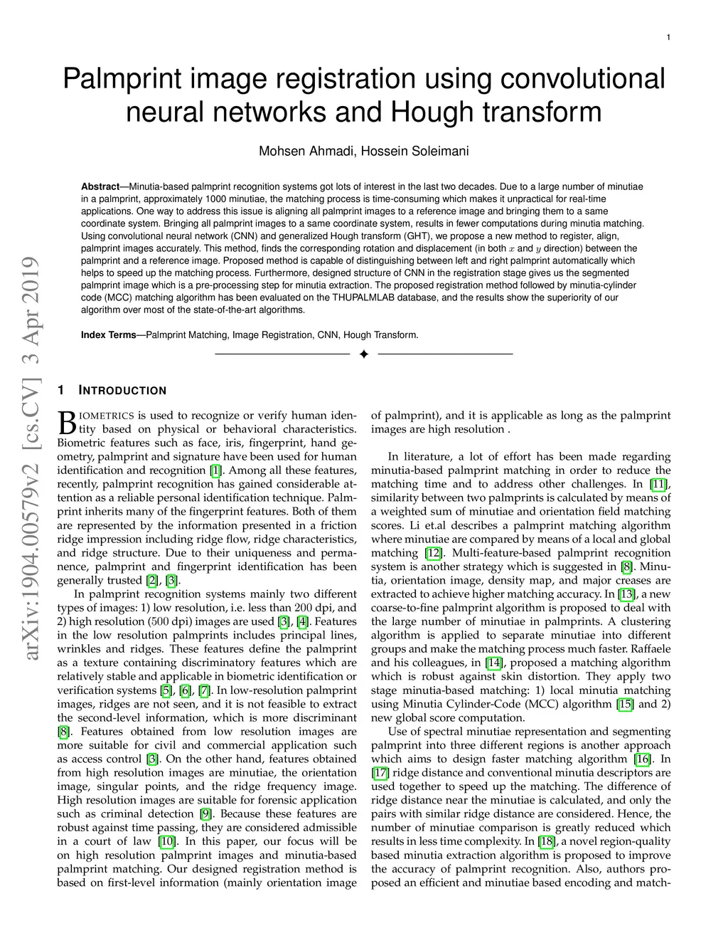 Minutia-based palmprint recognition systems has got lots of interest in last two decades. Due to the large number of minutiae in a palmprint, approximately 1000 minutiae, the matching process is time consuming which makes it unpractical for real time applications. One way to address this issue is aligning all palmprint images to a reference image and bringing them to a same coordinate system. Bringing all palmprint images to a same coordinate system, results in fewer computations during minutia matching. In this paper, using convolutional neural network (CNN) and generalized Hough transform (GHT), we propose a new method to register palmprint images accurately. This method, finds the corresponding rotation and displacement (in both x and y direction) between the palmprint and a reference image. Exact palmprint registration can enhance the speed and the accuracy of matching process. Proposed method is capable of distinguishing between left and right palmprint automatically which helps to speed up the matching process. Furthermore, designed structure of CNN in registration stage, gives us the segmented palmprint image from background which is a pre-processing step for minutia extraction. The proposed registration method followed by minutia-cylinder code (MCC) matching algorithm has been evaluated on the THUPALMLAB database, and the results show the superiority of our algorithm over most of the state-of-the-art algorithms.