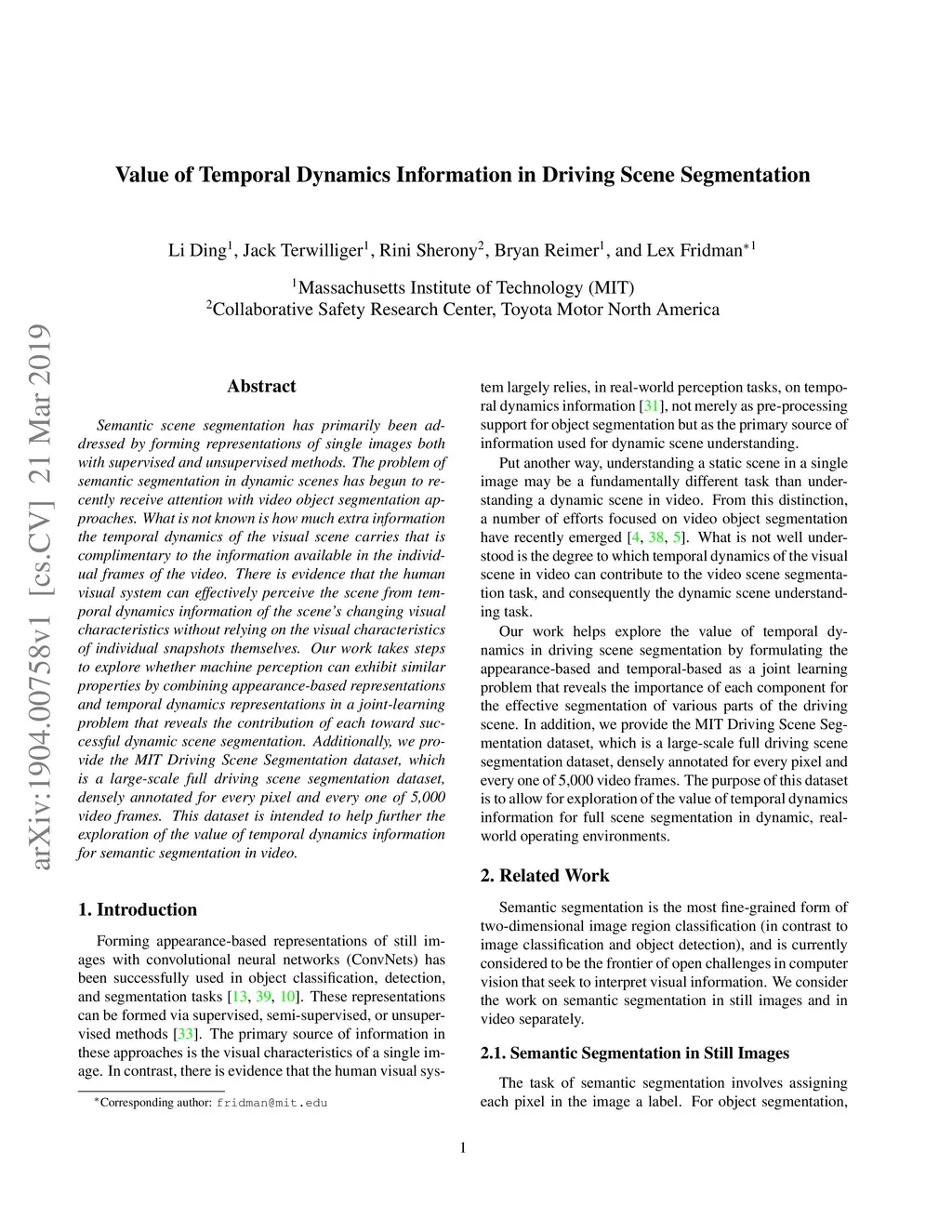 Semantic scene segmentation has primarily been addressed by forming representations of single images both with supervised and unsupervised methods. The problem of semantic segmentation in dynamic scenes has begun to recently receive attention with video object segmentation approaches. What is not known is how much extra information the temporal dynamics of the visual scene carries that is complimentary to the information available in the individual frames of the video. There is evidence that the human visual system can effectively perceive the scene from temporal dynamics information of the scene's changing visual characteristics without relying on the visual characteristics of individual snapshots themselves. Our work takes steps to explore whether machine perception can exhibit similar properties by combining appearance-based representations and temporal dynamics representations in a joint-learning problem that reveals the contribution of each toward successful dynamic scene segmentation. Additionally, we provide the MIT Driving Scene Segmentation dataset, which is a large-scale full driving scene segmentation dataset, densely annotated for every pixel and every one of 5,000 video frames. This dataset is intended to help further the exploration of the value of temporal dynamics information for semantic segmentation in video.