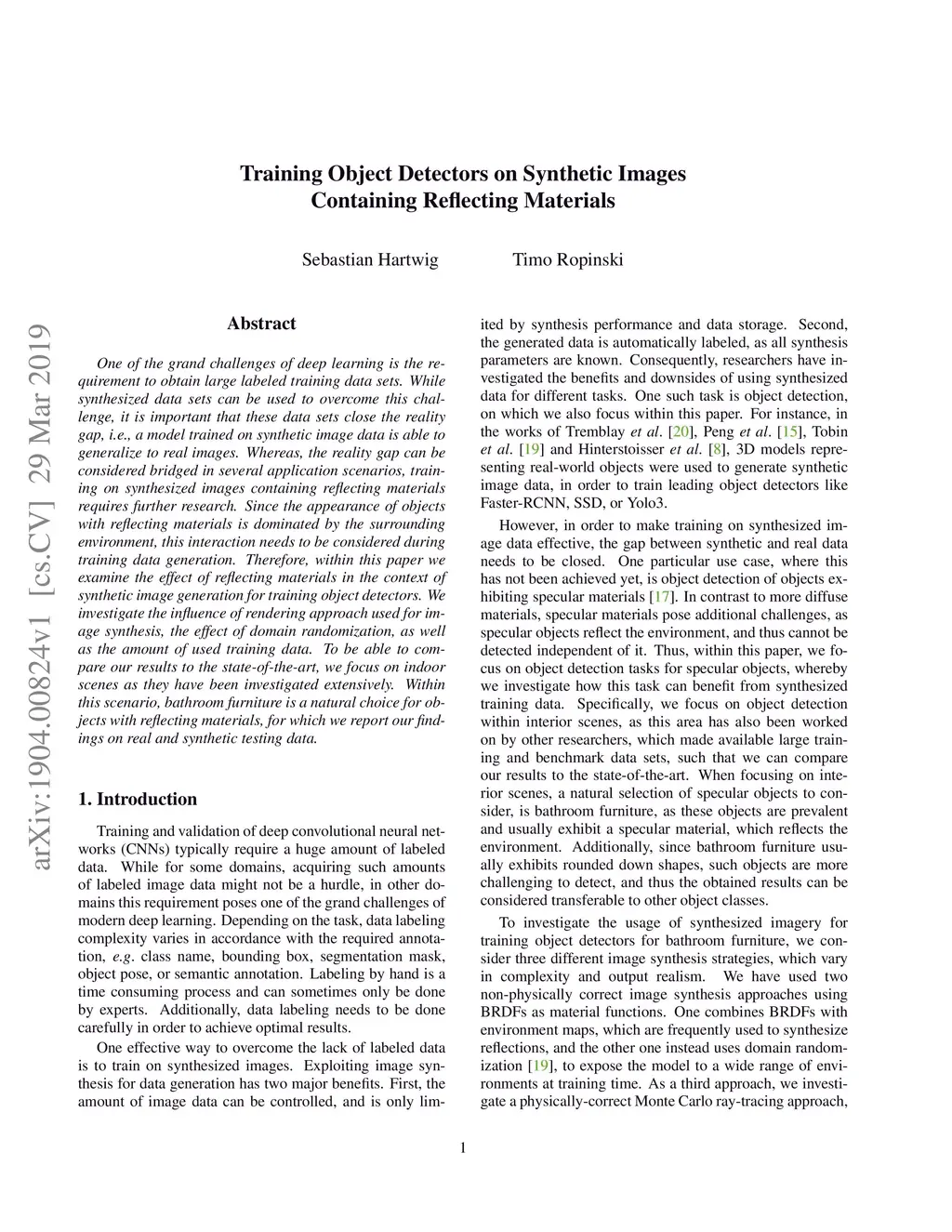 One of the grand challenges of deep learning is the requirement to obtain large labeled training data sets. While synthesized data sets can be used to overcome this challenge, it is important that these data sets close the reality gap, i.e., a model trained on synthetic image data is able to generalize to real images. Whereas, the reality gap can be considered bridged in several application scenarios, training on synthesized images containing reflecting materials requires further research. Since the appearance of objects with reflecting materials is dominated by the surrounding environment, this interaction needs to be considered during training data generation. Therefore, within this paper we examine the effect of reflecting materials in the context of synthetic image generation for training object detectors. We investigate the influence of rendering approach used for image synthesis, the effect of domain randomization, as well as the amount of used training data. To be able to compare our results to the state-of-the-art, we focus on indoor scenes as they have been investigated extensively. Within this scenario, bathroom furniture is a natural choice for objects with reflecting materials, for which we report our findings on real and synthetic testing data.