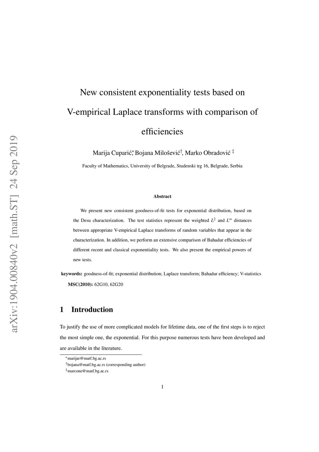 We present new consistent goodness-of-fit tests for exponential distribution, based on the Desu characterization. The test statistics represent the weighted and distances between appropriate V-empirical Laplace transforms of random variables that appear in the characterization. In addition, we perform an extensive comparison of Bahadur efficiencies of different recent and classical exponentiality tests. We also present the empirical powers of new tests.