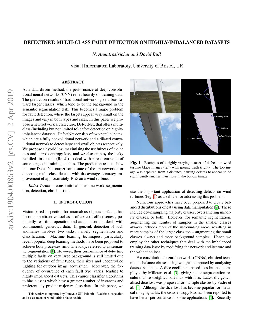As a data-driven method, the performance of deep convolutional neural networks (CNN) relies heavily on training data. The prediction results of traditional networks give a bias toward larger classes, which tend to be the background in the semantic segmentation task. This becomes a major problem for fault detection, where the targets appear very small on the images and vary in both types and sizes. In this paper we propose a new network architecture, DefectNet, that offers multi-class (including but not limited to) defect detection on highly-imbalanced datasets. DefectNet consists of two parallel paths, which are a fully convolutional network and a dilated convolutional network to detect large and small objects respectively. We propose a hybrid loss maximising the usefulness of a dice loss and a cross entropy loss, and we also employ the leaky rectified linear unit (ReLU) to deal with rare occurrence of some targets in training batches. The prediction results show that our DefectNet outperforms state-of-the-art networks for detecting multi-class defects with the average accuracy improvement of approximately 10% on a wind turbine.