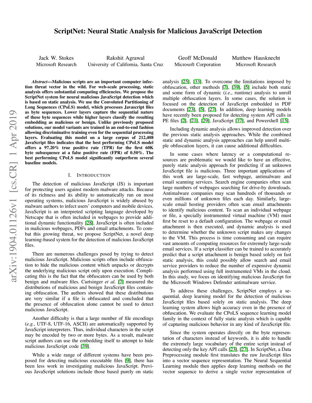 ScriptNet: Neural Static Analysis for Malicious JavaScript Detection