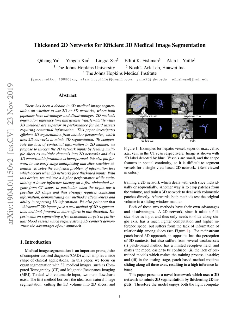 There has been a debate in 3D medical image segmentation on whether to use 2D or 3D networks, where both pipelines have advantages and disadvantages. 2D methods enjoy a low inference time and greater transfer-ability while 3D methods are superior in performance for hard targets requiring contextual information. This paper investigates efficient 3D segmentation from another perspective, which uses 2D networks to mimic 3D segmentation. To compensate the lack of contextual information in 2D manner, we propose to thicken the 2D network inputs by feeding multiple slices as multiple channels into 2D networks and thus 3D contextual information is incorporated. We also put forward to use early-stage multiplexing and slice sensitive attention to solve the confusion problem of information loss which occurs when 2D networks face thickened inputs. With this design, we achieve a higher performance while maintaining a lower inference latency on a few abdominal organs from CT scans, in particular when the organ has a peculiar 3D shape and thus strongly requires contextual information, demonstrating our method's effectiveness and ability in capturing 3D information. We also point out that "thickened" 2D inputs pave a new method of 3D segmentation, and look forward to more efforts in this direction. Experiments on segmenting a few abdominal targets in particular blood vessels which require strong 3D contexts demonstrate the advantages of our approach.