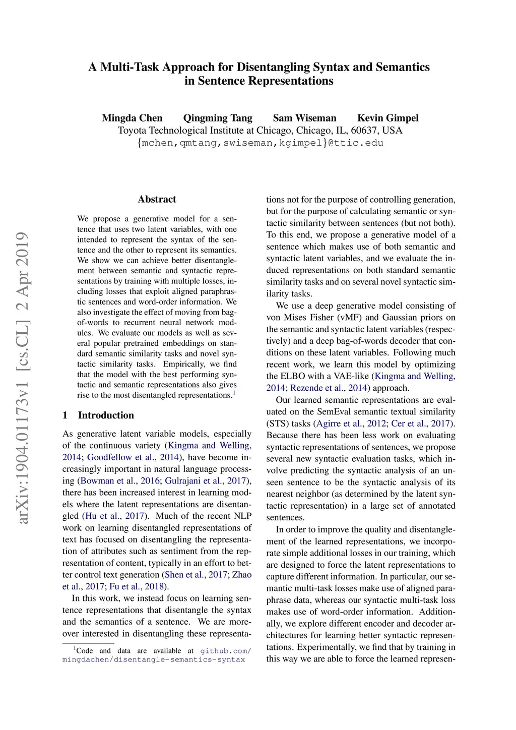 We propose a generative model for a sentence that uses two latent variables, with one intended to represent the syntax of the sentence and the other to represent its semantics. We show we can achieve better disentanglement between semantic and syntactic representations by training with multiple losses, including losses that exploit aligned paraphrastic sentences and word-order information. We also investigate the effect of moving from bag-of-words to recurrent neural network modules. We evaluate our models as well as several popular pretrained embeddings on standard semantic similarity tasks and novel syntactic similarity tasks. Empirically, we find that the model with the best performing syntactic and semantic representations also gives rise to the most disentangled representations.