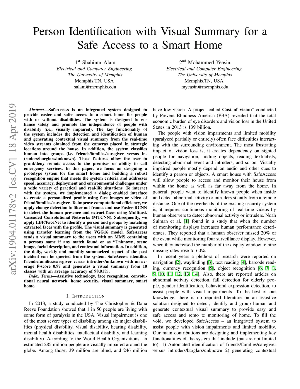 SafeAccess is an integrated system designed to provide easier and safer access to a smart home for people with or without disabilities. The system is designed to enhance safety and promote the independence of people with disability (i.e., visually impaired). The key functionality of the system includes the detection and identification of human and generating contextual visual summary from the real-time video streams obtained from the cameras placed in strategic locations around the house. In addition, the system classifies human into groups (i.e. friends/families/caregiver versus intruders/burglars/unknown). These features allow the user to grant/deny remote access to the premises or ability to call emergency services. In this paper, we focus on designing a prototype system for the smart home and building a robust recognition engine that meets the system criteria and addresses speed, accuracy, deployment and environmental challenges under a wide variety of practical and real-life situations. To interact with the system, we implemented a dialog enabled interface to create a personalized profile using face images or video of friend/families/caregiver. To improve computational efficiency, we apply change detection to filter out frames and use Faster-RCNN to detect the human presence and extract faces using Multitask Cascaded Convolutional Networks (MTCNN). Subsequently, we apply LBP/FaceNet to identify a person and groups by matching extracted faces with the profile. SafeAccess sends a visual summary to the users with an MMS containing a person's name if any match found or as "Unknown", scene image, facial description, and contextual information. SafeAccess identifies friends/families/caregiver versus intruders/unknown with an average F-score 0.97 and generates a visual summary from 10 classes with an average accuracy of 98.01%.
