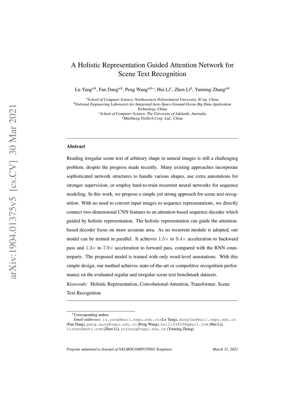 Reading irregular scene text of arbitrary shape in natural images is still a challenging problem, despite the progress made recently. Many existing approaches incorporate sophisticated network structures to handle various shapes, use extra annotations for stronger supervision, or employ hard-to-train recurrent neural networks for sequence modeling. In this work, we propose a simple yet strong approach for scene text recognition. With no need to convert input images to sequence representations, we directly connect two-dimensional CNN features to an attention-based sequence decoder which guided by holistic representation. The holistic representation can guide the attention-based decoder focus on more accurate area. As no recurrent module is adopted, our model can be trained in parallel. It achieves 1.5x to 9.4x acceleration to backward pass and 1.3x to 7.9x acceleration to forward pass, compared with the RNN counterparts. The proposed model is trained with only word-level annotations. With this simple design, our method achieves state-of-the-art or competitive recognition performance on the evaluated regular and irregular scene text benchmark datasets.