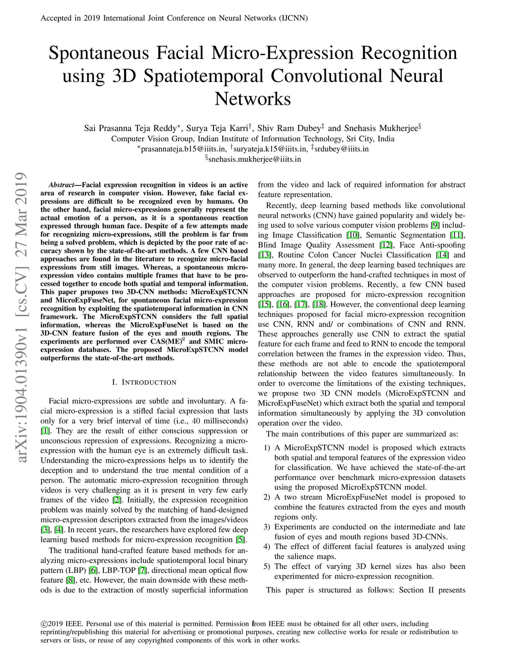 Facial expression recognition in videos is an active area of research in computer vision. However, fake facial expressions are difficult to be recognized even by humans. On the other hand, facial micro-expressions generally represent the actual emotion of a person, as it is a spontaneous reaction expressed through human face. Despite of a few attempts made for recognizing micro-expressions, still the problem is far from being a solved problem, which is depicted by the poor rate of accuracy shown by the state-of-the-art methods. A few CNN based approaches are found in the literature to recognize micro-facial expressions from still images. Whereas, a spontaneous micro-expression video contains multiple frames that have to be processed together to encode both spatial and temporal information. This paper proposes two 3D-CNN methods: MicroExpSTCNN and MicroExpFuseNet, for spontaneous facial micro-expression recognition by exploiting the spatiotemporal information in CNN framework. The MicroExpSTCNN considers the full spatial information, whereas the MicroExpFuseNet is based on the 3D-CNN feature fusion of the eyes and mouth regions. The experiments are performed over CAS(ME)^2 and SMIC micro-expression databases. The proposed MicroExpSTCNN model outperforms the state-of-the-art methods.