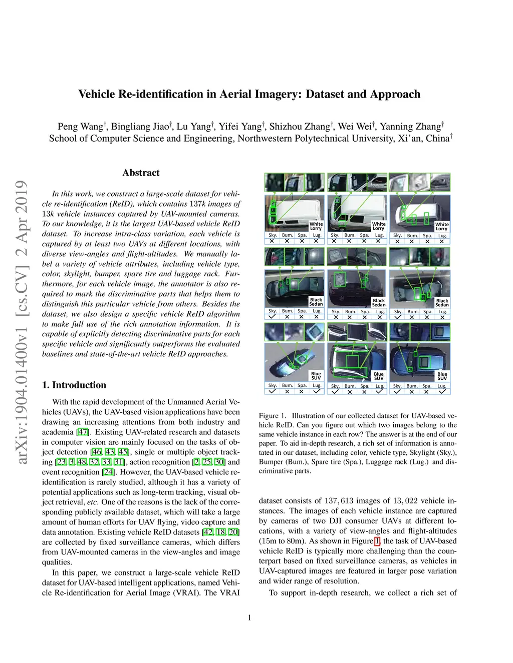 In this work, we construct a large-scale dataset for vehicle re-identification (ReID), which contains 137k images of 13k vehicle instances captured by UAV-mounted cameras. To our knowledge, it is the largest UAV-based vehicle ReID dataset. To increase intra-class variation, each vehicle is captured by at least two UAVs at different locations, with diverse view-angles and flight-altitudes. We manually label a variety of vehicle attributes, including vehicle type, color, skylight, bumper, spare tire and luggage rack. Furthermore, for each vehicle image, the annotator is also required to mark the discriminative parts that helps them to distinguish this particular vehicle from others. Besides the dataset, we also design a specific vehicle ReID algorithm to make full use of the rich annotation information. It is capable of explicitly detecting discriminative parts for each specific vehicle and significantly outperforms the evaluated baselines and state-of-the-art vehicle ReID approaches.
