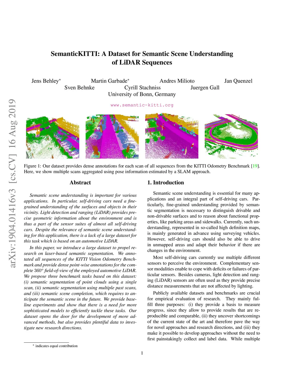 Semantic scene understanding is important for various applications. In particular, self-driving cars need a fine-grained understanding of the surfaces and objects in their vicinity. Light detection and ranging (LiDAR) provides precise geometric information about the environment and is thus a part of the sensor suites of almost all self-driving cars. Despite the relevance of semantic scene understanding for this application, there is a lack of a large dataset for this task which is based on an automotive LiDAR. In this paper, we introduce a large dataset to propel research on laser-based semantic segmentation. We annotated all sequences of the KITTI Vision Odometry Benchmark and provide dense point-wise annotations for the complete field-of-view of the employed automotive LiDAR. We propose three benchmark tasks based on this dataset: (i) semantic segmentation of point clouds using a single scan, (ii) semantic segmentation using multiple past scans, and (iii) semantic scene completion, which requires to anticipate the semantic scene in the future. We provide baseline experiments and show that there is a need for more sophisticated models to efficiently tackle these tasks. Our dataset opens the door for the development of more advanced methods, but also provides plentiful data to investigate new research directions.