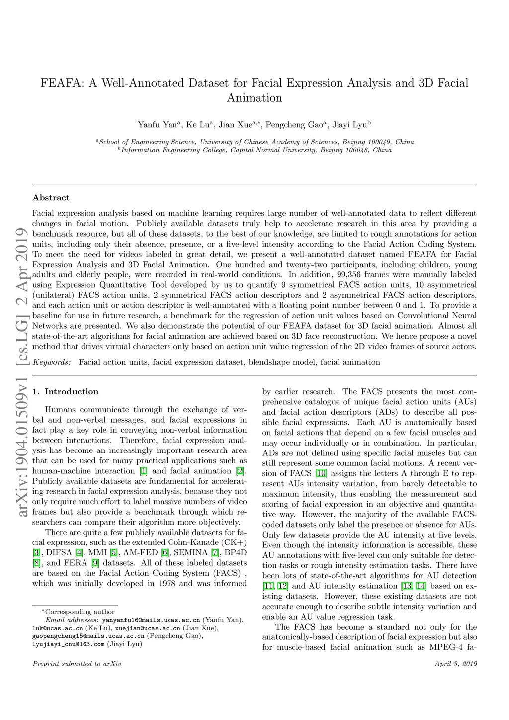 Facial expression analysis based on machine learning requires large number of well-annotated data to reflect different changes in facial motion. Publicly available datasets truly help to accelerate research in this area by providing a benchmark resource, but all of these datasets, to the best of our knowledge, are limited to rough annotations for action units, including only their absence, presence, or a five-level intensity according to the Facial Action Coding System. To meet the need for videos labeled in great detail, we present a well-annotated dataset named FEAFA for Facial Expression Analysis and 3D Facial Animation. One hundred and twenty-two participants, including children, young adults and elderly people, were recorded in real-world conditions. In addition, 99,356 frames were manually labeled using Expression Quantitative Tool developed by us to quantify 9 symmetrical FACS action units, 10 asymmetrical (unilateral) FACS action units, 2 symmetrical FACS action descriptors and 2 asymmetrical FACS action descriptors, and each action unit or action descriptor is well-annotated with a floating point number between 0 and 1. To provide a baseline for use in future research, a benchmark for the regression of action unit values based on Convolutional Neural Networks are presented. We also demonstrate the potential of our FEAFA dataset for 3D facial animation. Almost all state-of-the-art algorithms for facial animation are achieved based on 3D face reconstruction. We hence propose a novel method that drives virtual characters only based on action unit value regression of the 2D video frames of source actors.