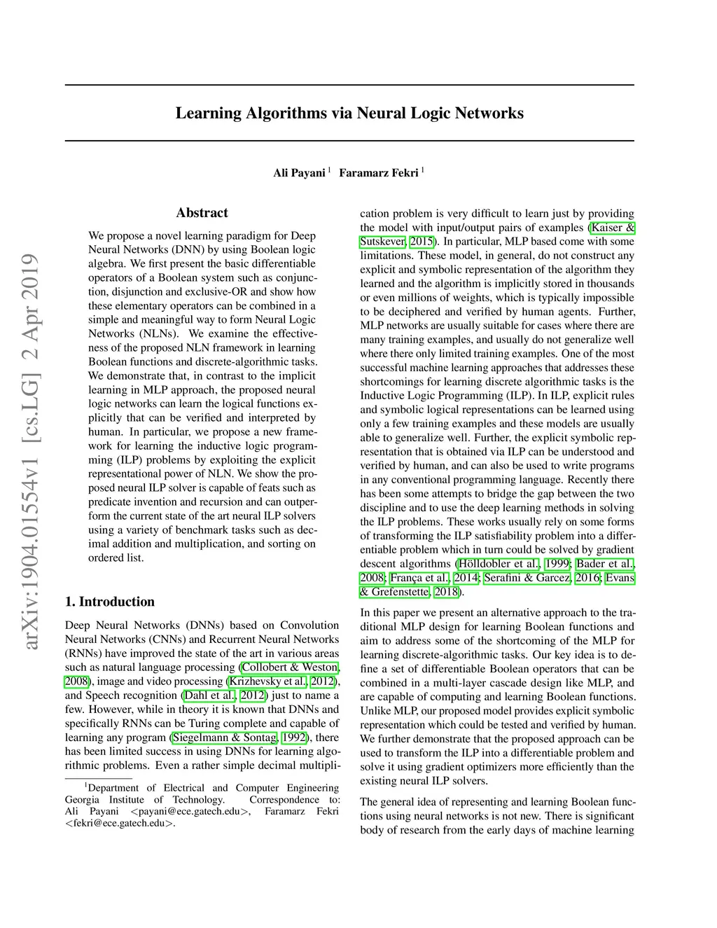 We propose a novel learning paradigm for Deep Neural Networks (DNN) by using Boolean logic algebra. We first present the basic differentiable operators of a Boolean system such as conjunction, disjunction and exclusive-OR and show how these elementary operators can be combined in a simple and meaningful way to form Neural Logic Networks (NLNs). We examine the effectiveness of the proposed NLN framework in learning Boolean functions and discrete-algorithmic tasks. We demonstrate that, in contrast to the implicit learning in MLP approach, the proposed neural logic networks can learn the logical functions explicitly that can be verified and interpreted by human. In particular, we propose a new framework for learning the inductive logic programming (ILP) problems by exploiting the explicit representational power of NLN. We show the proposed neural ILP solver is capable of feats such as predicate invention and recursion and can outperform the current state of the art neural ILP solvers using a variety of benchmark tasks such as decimal addition and multiplication, and sorting on ordered list.