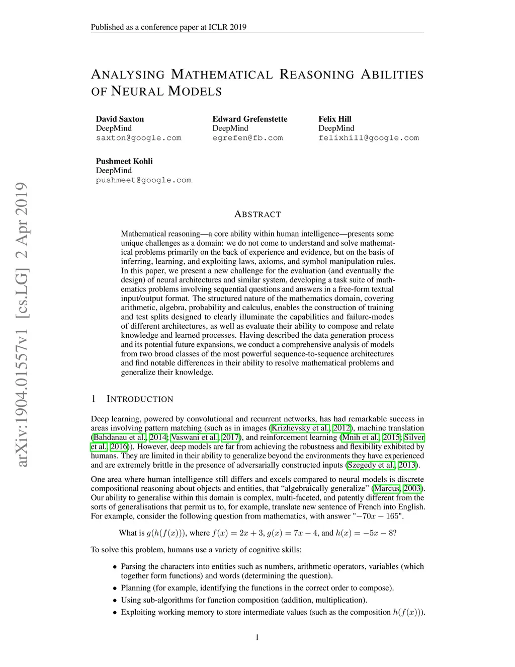 Mathematical reasoning---a core ability within human intelligence---presents some unique challenges as a domain: we do not come to understand and solve mathematical problems primarily on the back of experience and evidence, but on the basis of inferring, learning, and exploiting laws, axioms, and symbol manipulation rules. In this paper, we present a new challenge for the evaluation (and eventually the design) of neural architectures and similar system, developing a task suite of mathematics problems involving sequential questions and answers in a free-form textual input/output format. The structured nature of the mathematics domain, covering arithmetic, algebra, probability and calculus, enables the construction of training and test splits designed to clearly illuminate the capabilities and failure-modes of different architectures, as well as evaluate their ability to compose and relate knowledge and learned processes. Having described the data generation process and its potential future expansions, we conduct a comprehensive analysis of models from two broad classes of the most powerful sequence-to-sequence architectures and find notable differences in their ability to resolve mathematical problems and generalize their knowledge.