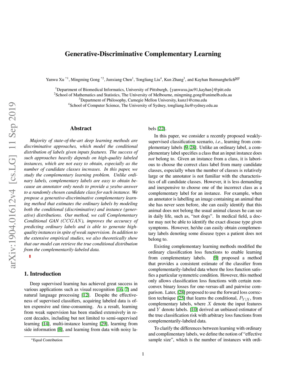 Majority of state-of-the-art deep learning methods are discriminative approaches, which model the conditional distribution of labels given inputs features. The success of such approaches heavily depends on high-quality labeled instances, which are not easy to obtain, especially as the number of candidate classes increases. In this paper, we study the complementary learning problem. Unlike ordinary labels, complementary labels are easy to obtain because an annotator only needs to provide a yes/no answer to a randomly chosen candidate class for each instance. We propose a generative-discriminative complementary learning method that estimates the ordinary labels by modeling both the conditional (discriminative) and instance (generative) distributions. Our method, we call Complementary Conditional GAN (CCGAN), improves the accuracy of predicting ordinary labels and can generate high-quality instances in spite of weak supervision. In addition to the extensive empirical studies, we also theoretically show that our model can retrieve the true conditional distribution from the complementarily-labeled data.
