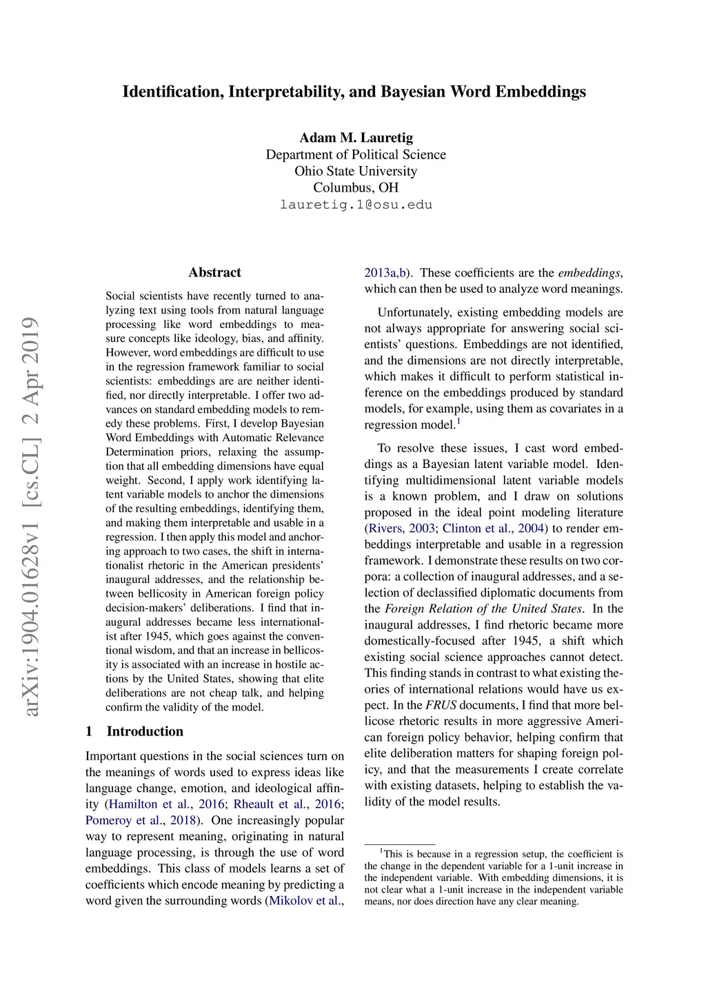 Social scientists have recently turned to analyzing text using tools from natural language processing like word embeddings to measure concepts like ideology, bias, and affinity. However, word embeddings are difficult to use in the regression framework familiar to social scientists: embeddings are are neither identified, nor directly interpretable. I offer two advances on standard embedding models to remedy these problems. First, I develop Bayesian Word Embeddings with Automatic Relevance Determination priors, relaxing the assumption that all embedding dimensions have equal weight. Second, I apply work identifying latent variable models to anchor the dimensions of the resulting embeddings, identifying them, and making them interpretable and usable in a regression. I then apply this model and anchoring approach to two cases, the shift in internationalist rhetoric in the American presidents' inaugural addresses, and the relationship between bellicosity in American foreign policy decision-makers' deliberations. I find that inaugural addresses became less internationalist after 1945, which goes against the conventional wisdom, and that an increase in bellicosity is associated with an increase in hostile actions by the United States, showing that elite deliberations are not cheap talk, and helping confirm the validity of the model.